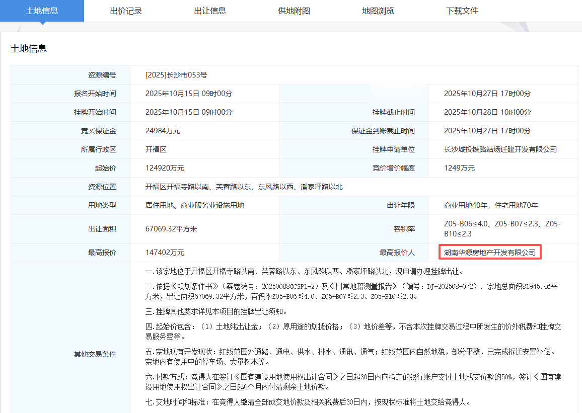2025年10月28日,长沙土拍市场迎来久违的高光时刻。开福中心[2025]长沙市053号地块在3家房企19轮激烈竞价后,最终由保利发展旗下湖南华源房地产开发有限公司以14.74亿元摘得,楼面价高达8497元/㎡,溢价率18%。