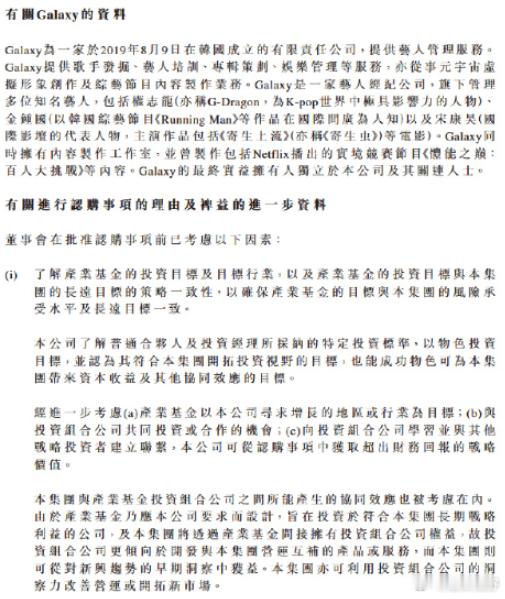 公告指,产业基金的首次交割已完成,公司出资800万美元认购产业基金的权益,即权益的16%,馀下权益由两名独立第三方持有。成为Galaxy的战略股东预期将为公司带来多方面的协同效益,双方正就策略性合作的细节进行深入讨论,合作范畴包括但不限于与Galaxy艺人合作举办展览、演唱会、艺人IP及衍生品开发等。