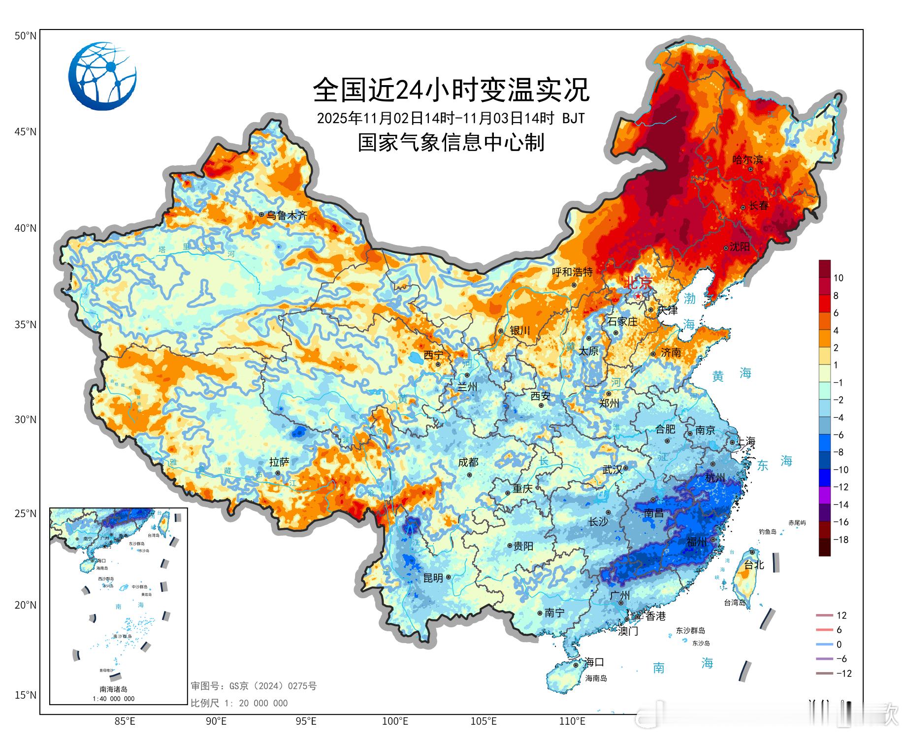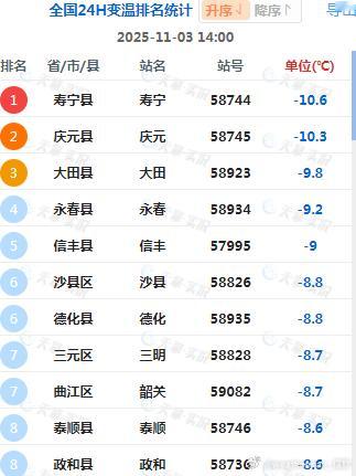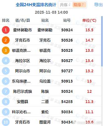 【气温——北升南降】今天白天北方大多晴朗干燥,在冷空气过后,内蒙古中东部和东北出现6-16℃升温。内蒙古霍林郭勒升15.5℃,为14时全国升温最强站点。南方因为阴雨,光照减少,气温下降。浙江福建江西广东部分地区,降温6-10℃,福建寿宁降10.6℃、浙江庆元降10.3℃、江西信丰降9℃、广东韶关降8.7℃,为各自省份14时降温最强站点。