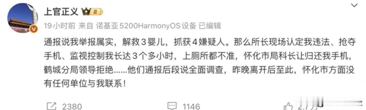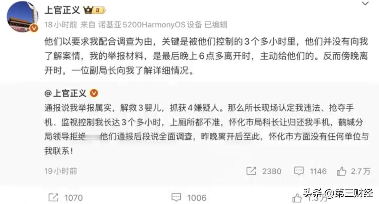 据上海早晨直播间新闻报道,11月1日,知名打假人上官正义举报疑似贩卖婴儿犯罪线索,反被派出所扣留。具体原因是什么?目前,没有相关部门对此事作出回应。 倒卖婴儿案 打假