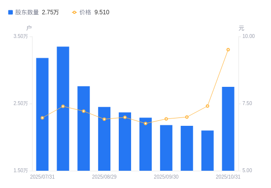 日期A股户数(户)流通A股户均持股数(股)户均持股市值(万元)2025-10-312750012582.1711.972025-10-202100016476.6612.212025-10-102170015945.1511.162025-09-302179515875.6511.002025-09-192290015109.6010.212025-09-102370014599.5710.212025-08-292450014122.859.772025-08-202760012536.599.052025-08-083350010328.657.642025-07-313180010880.817.58