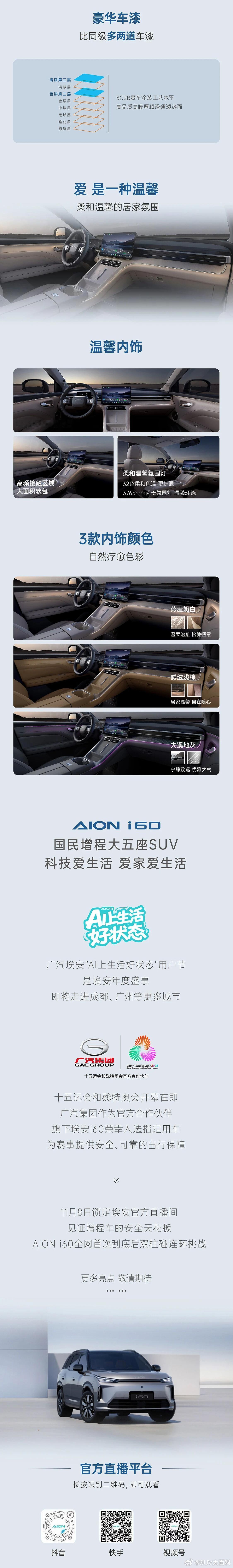 埃安i60 今晚开启预售,增程版12.68万起,纯电版11.98万起;99元下订可享4个仿麂皮副头枕、养护礼、11扬ADiGO Sound音响