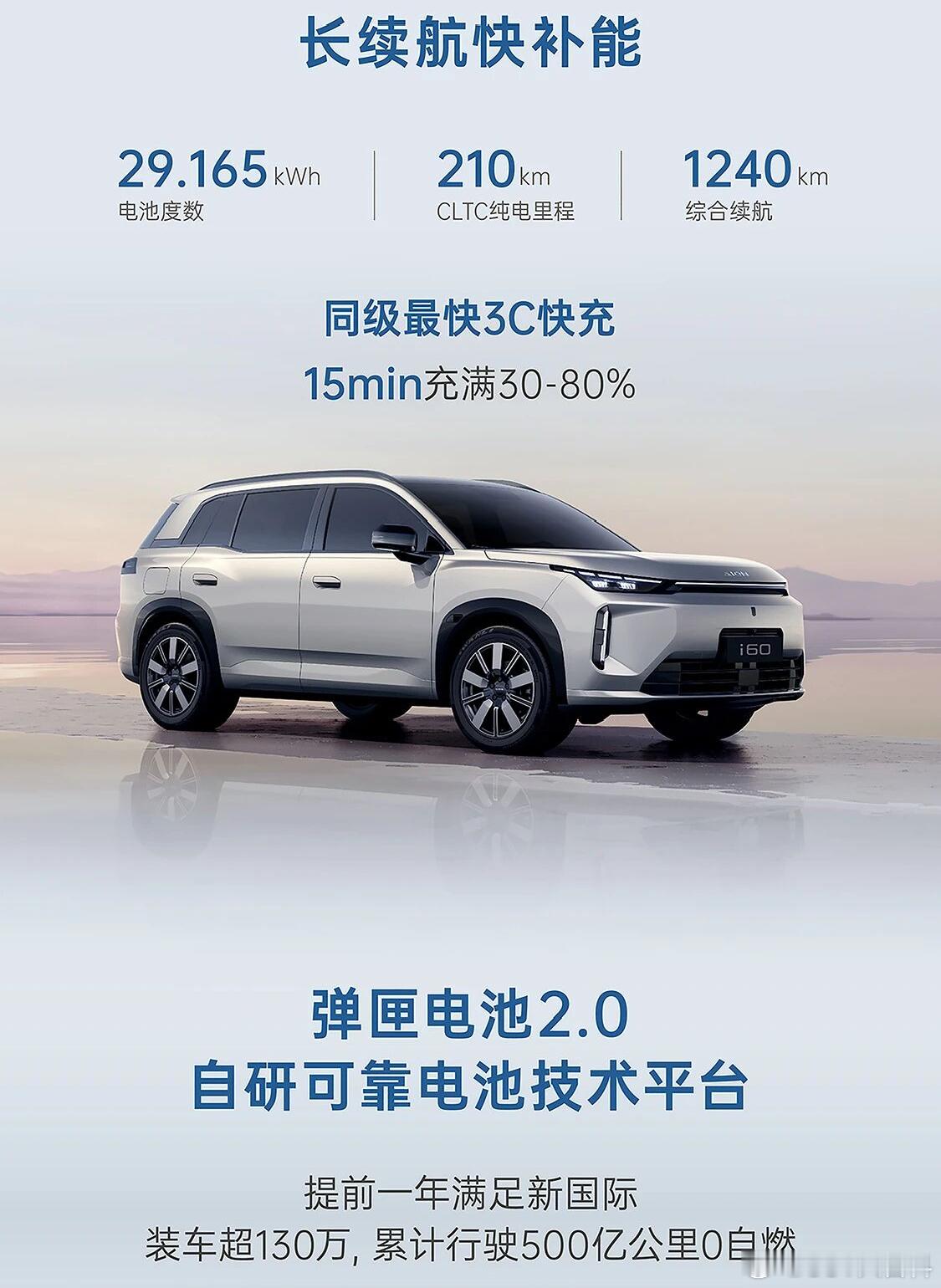 增程版搭载1.5L增程器(74kW)+85kW发电机+180kW后电机+29.165度电,油电转化率3.73kWh/L,CLTC纯电续航210公里,综合续航1240km,亏电油耗5.5L/100km,15分钟充满30-80%