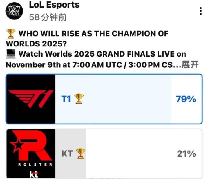 拳头官方发文表示有八成的观众看好T1拿下S15冠军! 其实回忆一下T1在s7和s12这两次决赛失利,17年确实是很多队内问题被掩盖了!当时除了faker其他选手或多或少状态都出现了问题,而22年那次我觉得轻敌的因素占主要的,当时t1在前面淘汰赛表现强势有点低估了drx的实力! 而今年t1在前面展现的实力是有问题的,但和tes的半决赛之后感觉已经完全调整回来了!而kt如果保持在对阵gen时的高效,面对t1绝对是有得打的。但感觉t1对阵kt又有很强的心理优势,所以这场决赛最后谁获胜还真的不好说。 英雄联盟S15 英雄联盟[超话]
