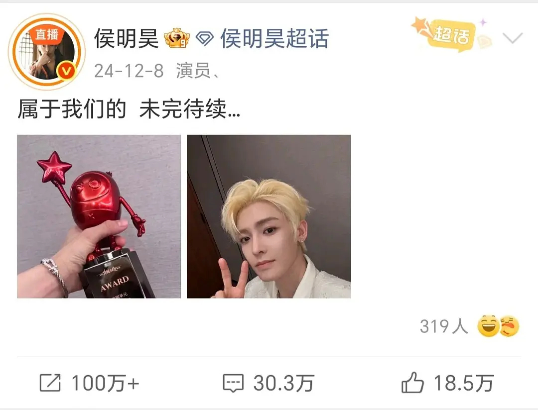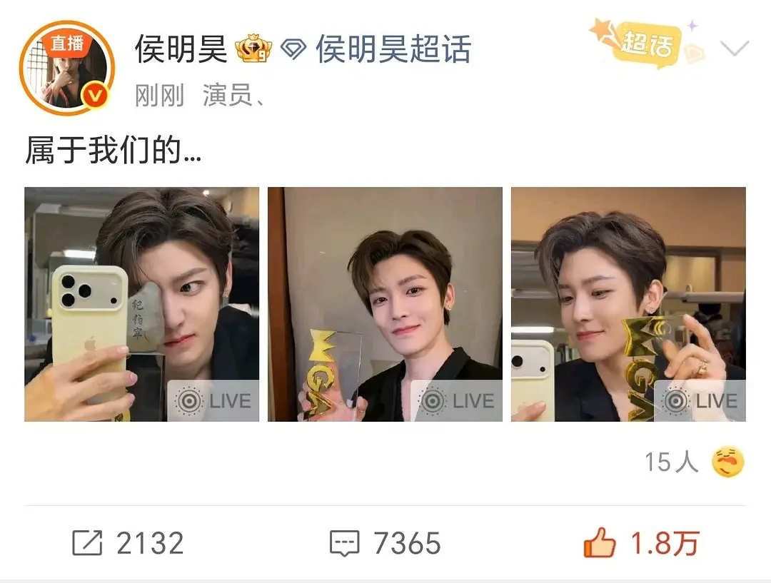 侯明昊,真的是很事业型,很爱粉丝的一款,时间始终如一,生粉天堂