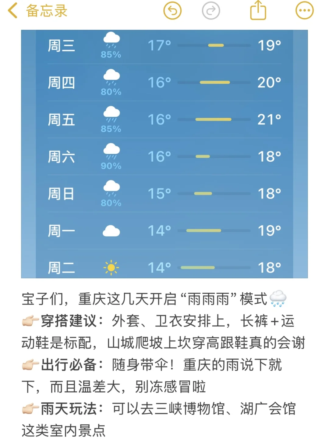 重庆天气变化真的太快了在冷素和热素之间徘徊!所以薄外套一件!!雨伞☔️安排一下谢谢!!!鞋子!运动鞋要穿!!!