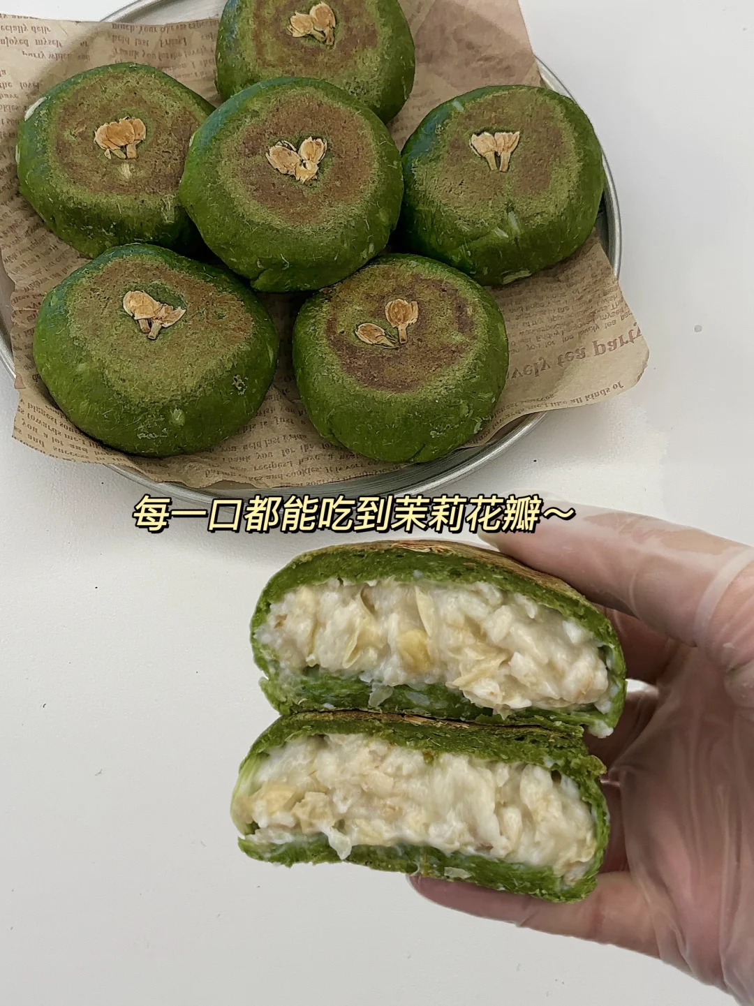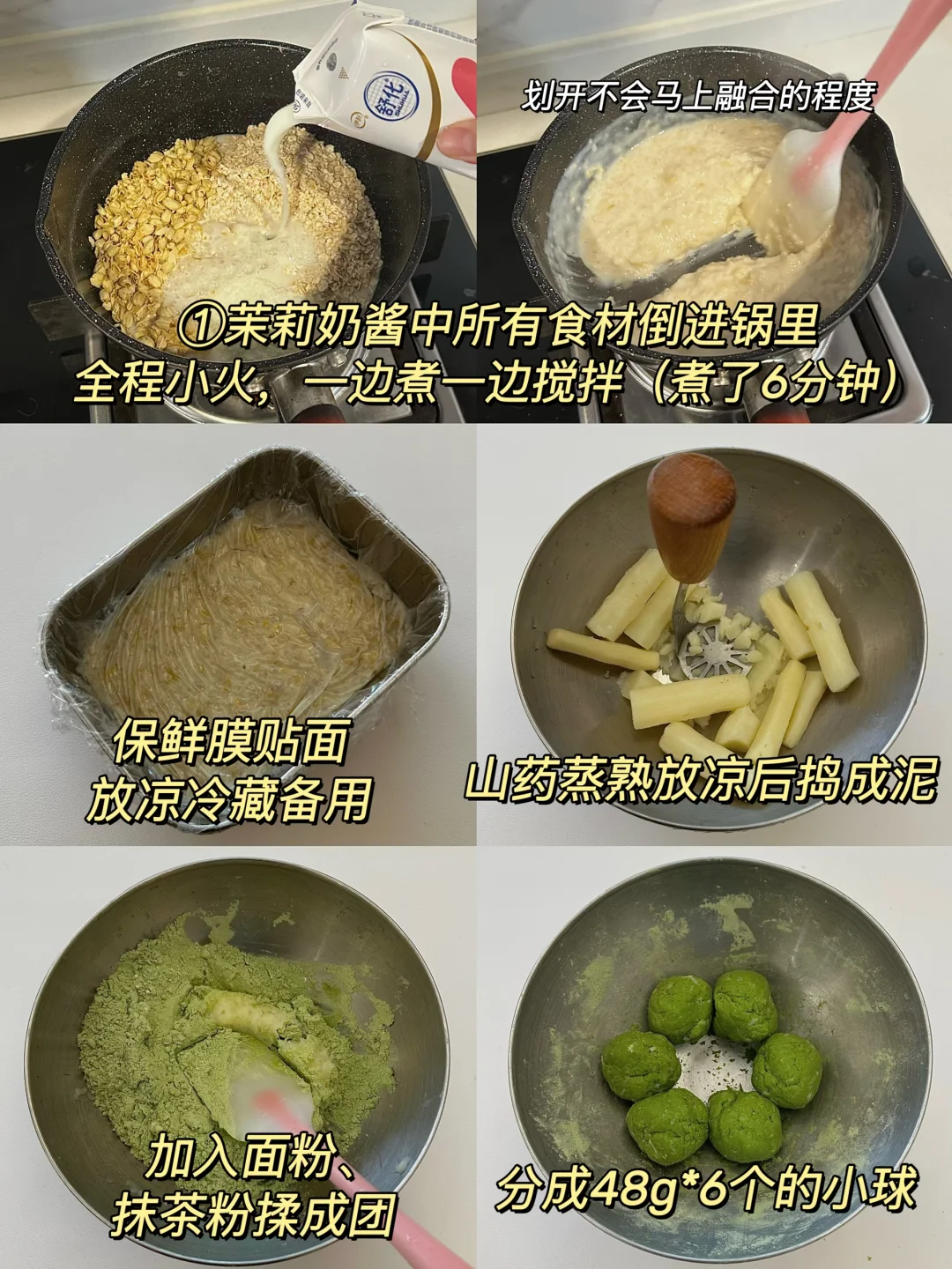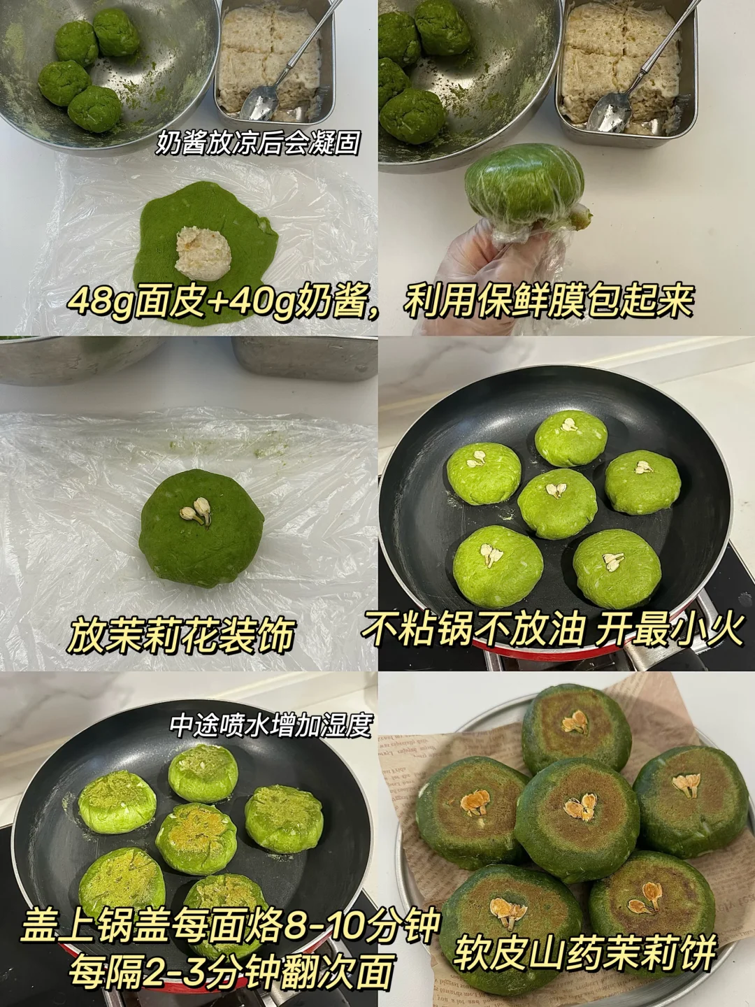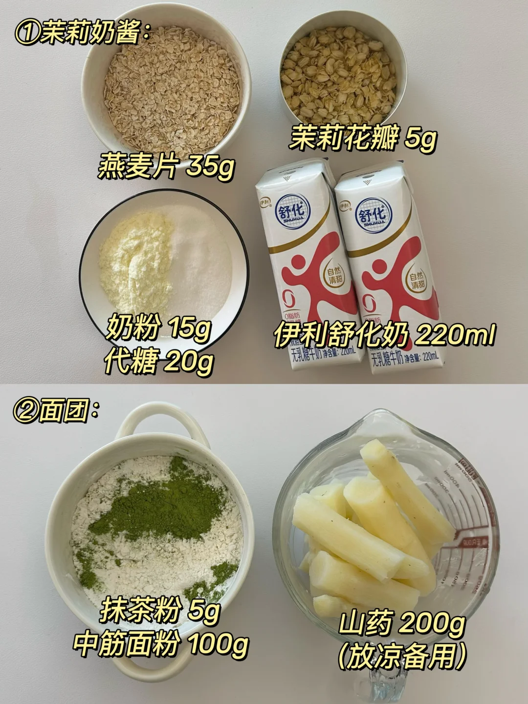 抹茶茉莉奶酱饼 家里有口锅就👌🏻,趁热吃一口爆浆~ 清新香甜的茉莉奶酱,搭配软糯山药皮! · 食材🥞6个: ①茉莉奶酱:燕麦片 35g|茉莉花瓣 5g|伊利脱脂舒化奶 220ml | 代糖 20g|奶粉 15g ②面皮:铁棍山药 200g|中筋面粉100g|抹茶粉 5g · 伊利脱脂舒化奶太适合体重管理啦! 0脂肪0乳糖0添加蔗糖,适合乳糖不耐受的bb~ 口感清新好喝的同时,每100ml还含有3.2g蛋白质和100mg钙的营养哦