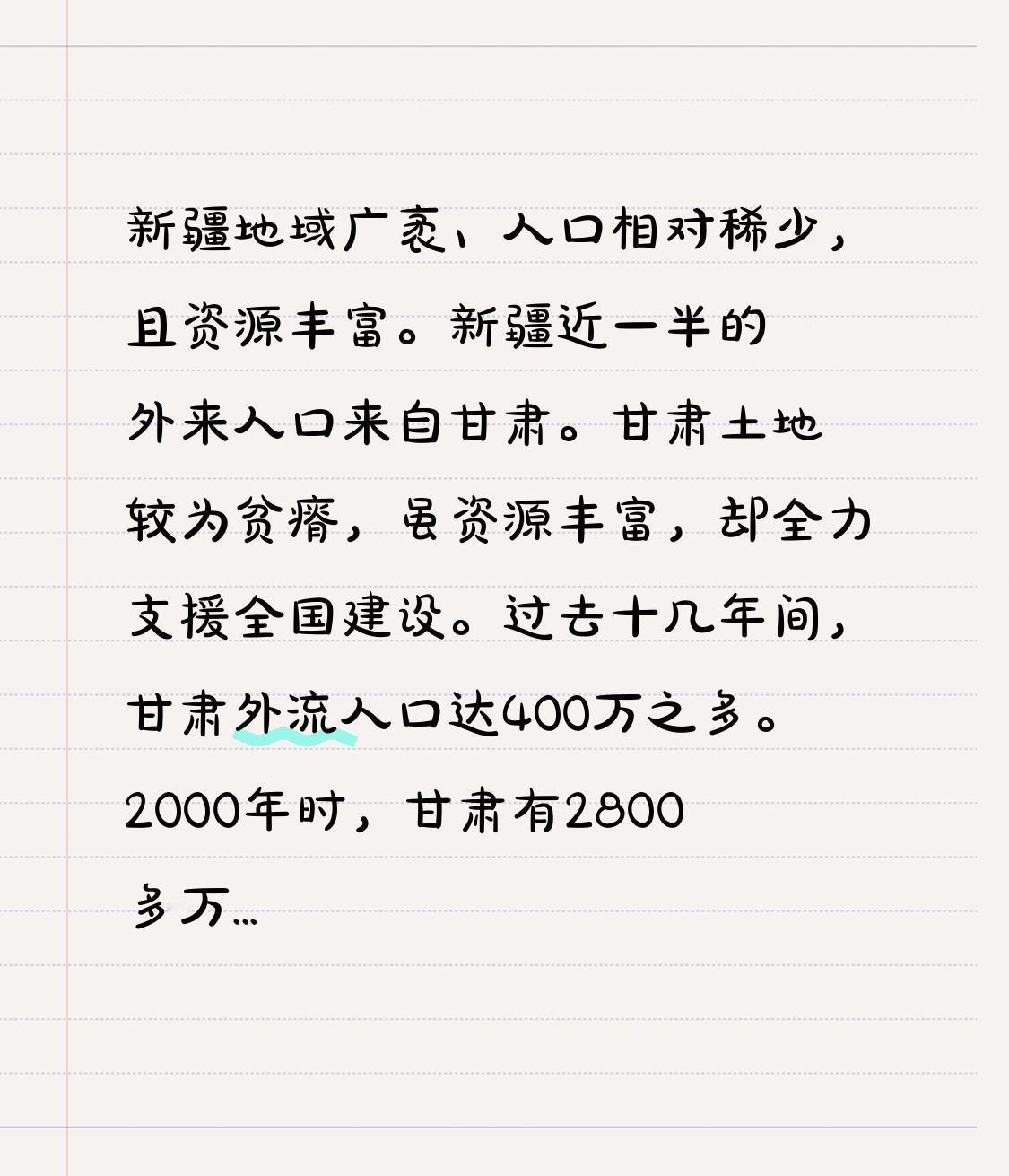 新疆地域广袤、人口相对稀少,且资源丰富。新疆近一半的外来人口来自甘肃。甘肃土地较为贫瘠,虽资源丰富,却全力支援全国建设。过去十几年间,甘肃外流人口达400万之多。2000年时,甘肃有2800多万人口,到2020年仅剩2400多万。照此趋势,再过十几年,甘肃人口或许只剩2000万了。