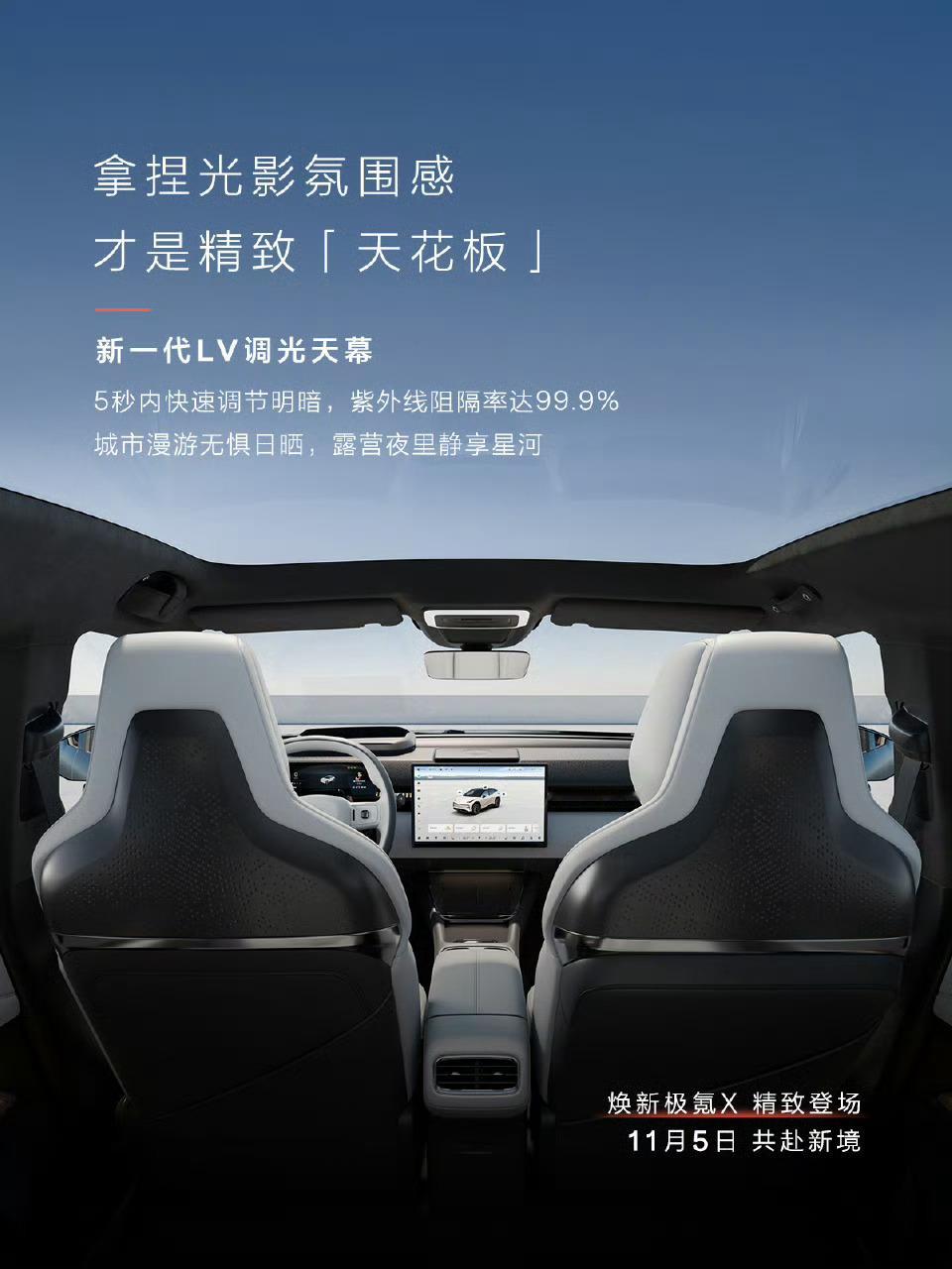 焕新极氪X不仅是外观精致,而且还有很多实用的配置,智能感应无框自动门、调光天幕、