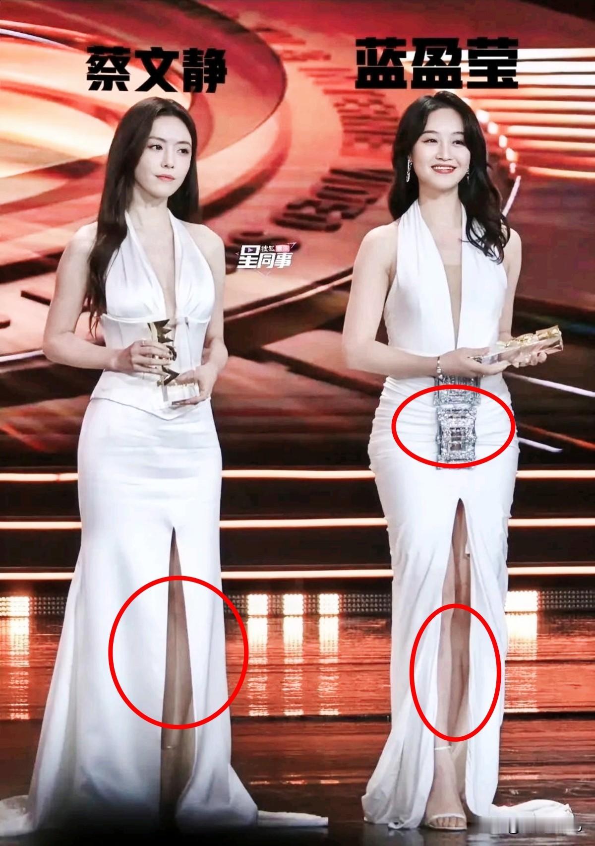 昨晚的红毯上发生了一件尴尬的事 两位女星蓝盈莹和蔡文静撞衫了,穿了一样的白色挂脖深V长裙,发型和鞋子都相似度极高,一时间成了焦点,谁知两人还一起同台领奖,尴尬程度可想而知。 要说最惨的还是两个助理吧,一个傻眼了,一个马上掏出手机拍照留念,说不定哪天撞衫了还能发个朋友圈。 两人穿的不是同一件衣服,但都属于同一个款式,挂脖设计,深V领,白色长裙,拉远了看两人的裙子几乎可以说是一个模子刻出来的,不过颜值还是在线的,各有各的好看风格也不一样。 你更喜欢谁呢?