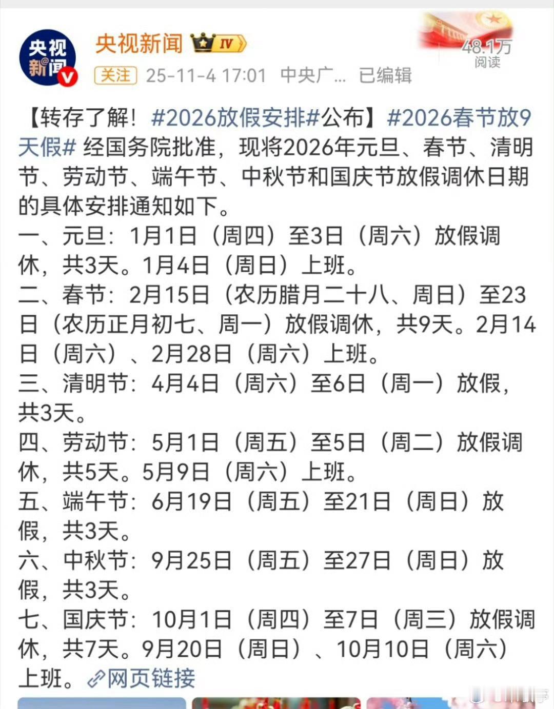 2026春节放9天假转眼又是一年,2026年假期安排都出来了,2025年的节假日