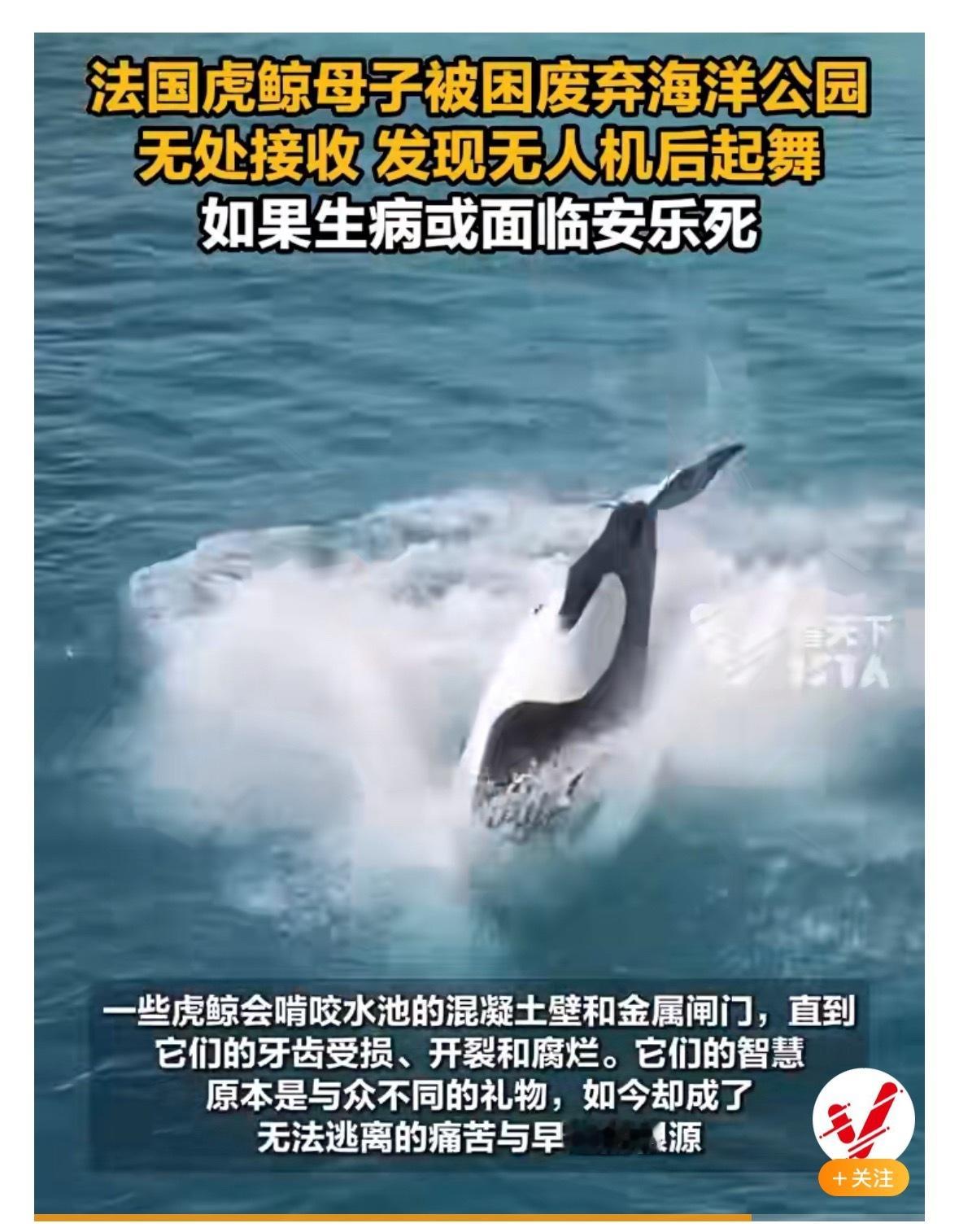 法国废弃公园虎鲸母子或面临安乐死上次是加拿大,这次是法国,这些以人权和动物保护为口头禅和干涉别国的国家,在自家的问题上,都是这个德行,虚伪至极!实在为这些充满灵性的生命难过….谁可以救救它们….