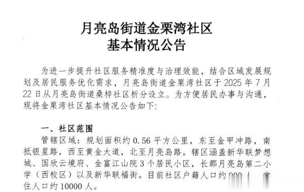 去年年中,又新冒出来一个金栗湾社区,是从桑梓社区析分而来,详情如下: