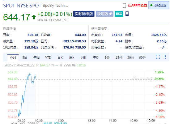 过去一年,受提价、成本结构优化及人工智能(AI)驱动产品创新的乐观预期推动,Spotify股价累计上涨约70%。目前其股价在640美元左右波动,较今年早些时候约775美元的历史收盘高点有所回落。