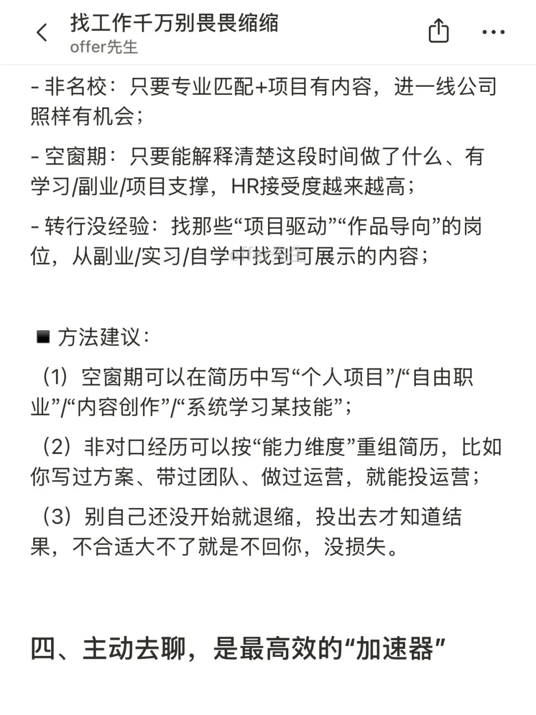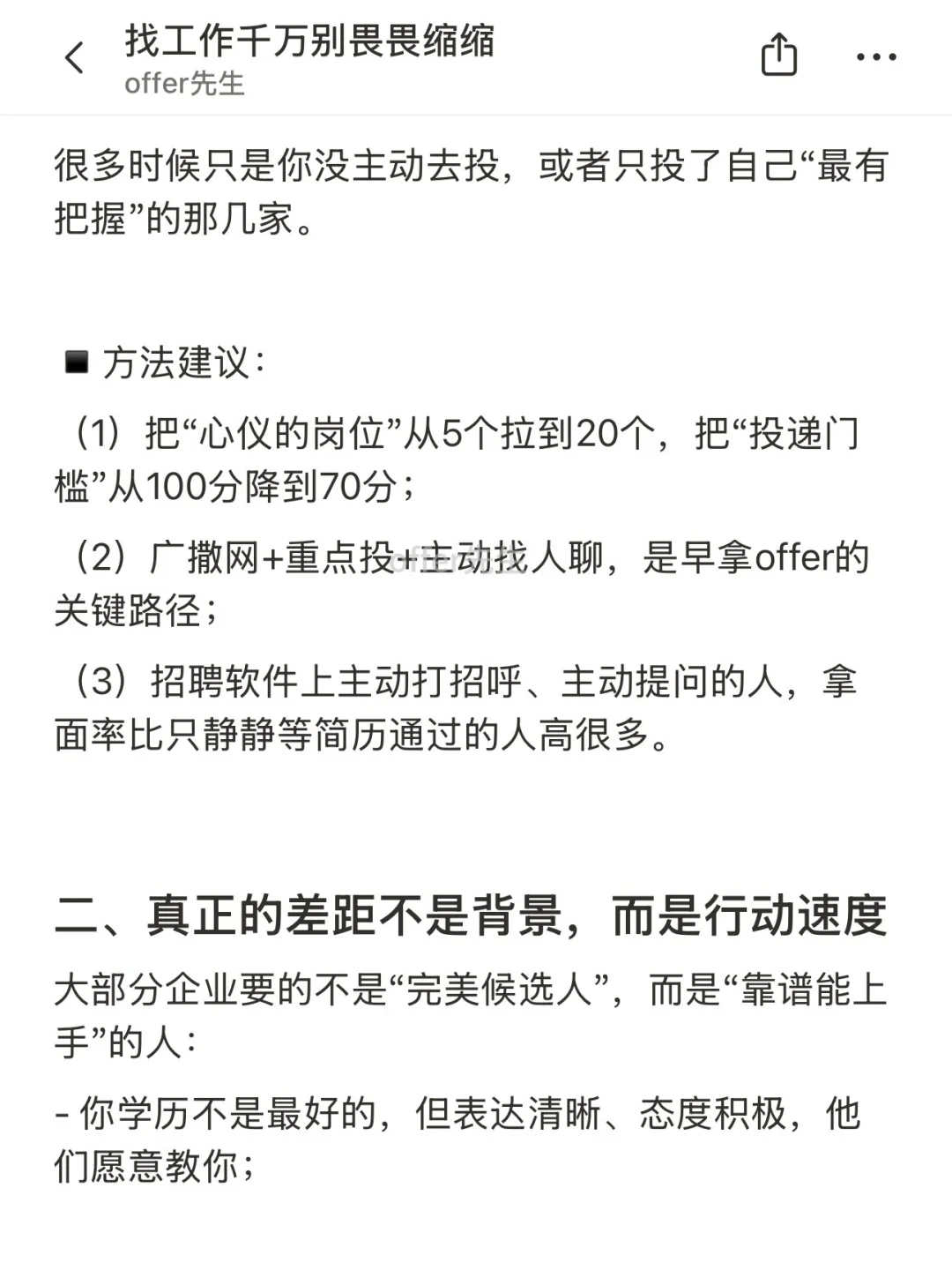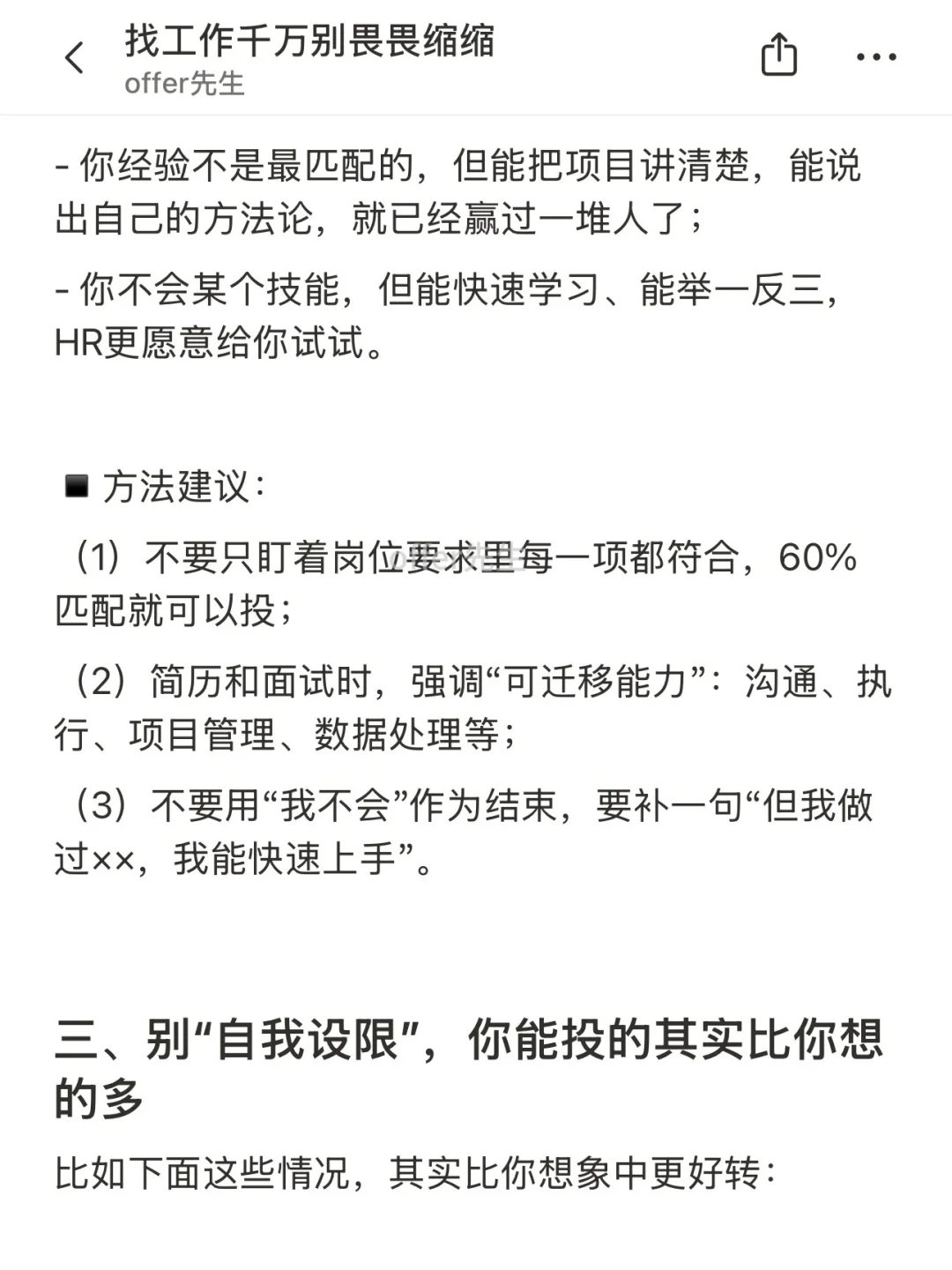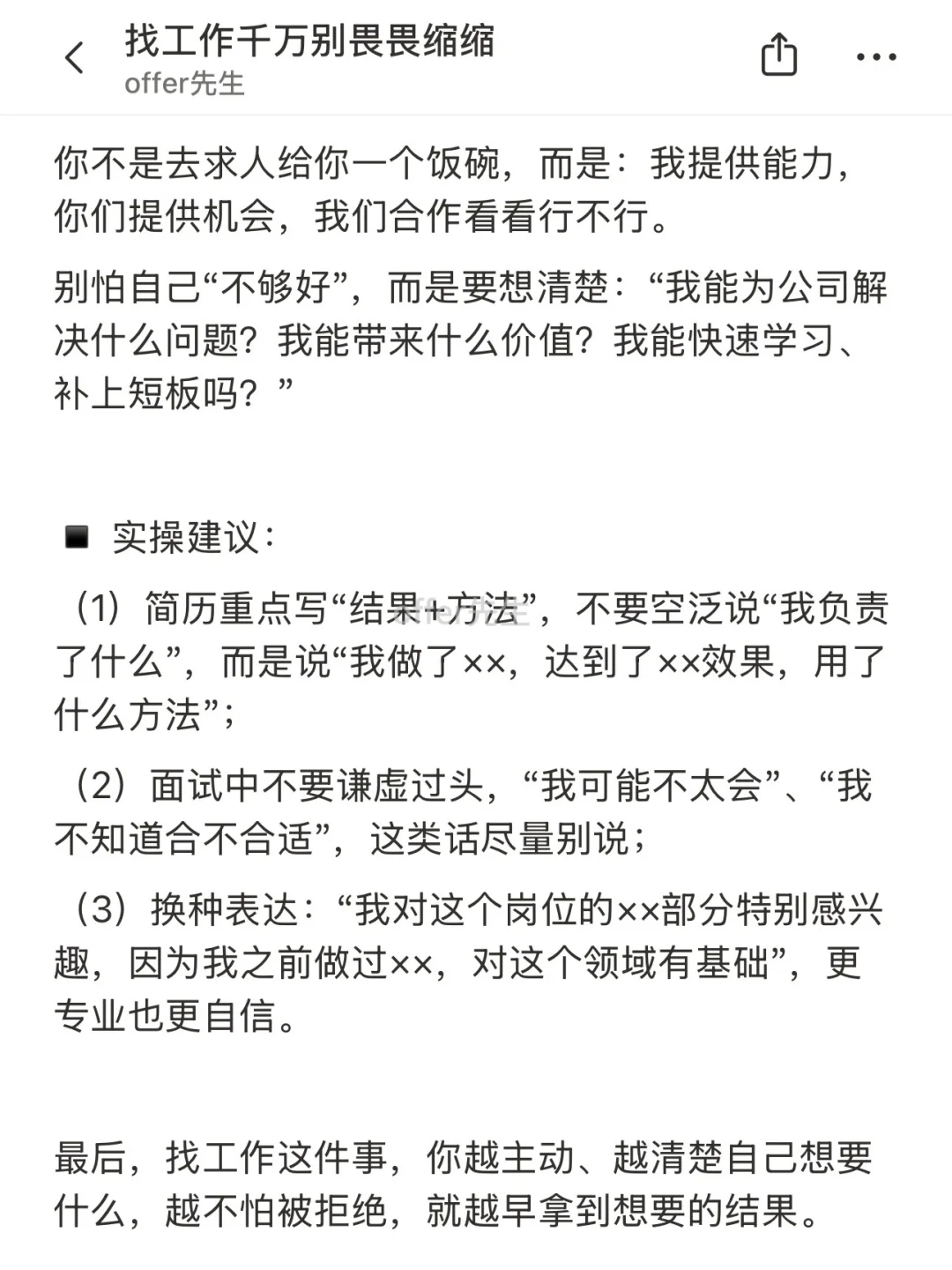 很多人找工作失败,不是因为能力不够,而是输在了“自己先否定了自己”。 ▪️看见岗位不错,却说“人家肯定不要我” ▪️想投简历,却纠结“我这个经历太拉了吧” ▪️面试机会来了,却觉得“我准备得还不够,再等等” . 其实找工作这件事,你越主动、越清楚自己想要什么,越不怕被拒绝,就越早拿到想要的结果。 . 一个认真分享“找工作”干货的账号。真诚、有料、不说空话,只想用真实经历、具体方法,帮大家少走点弯路 .