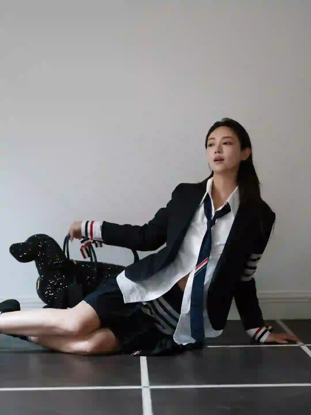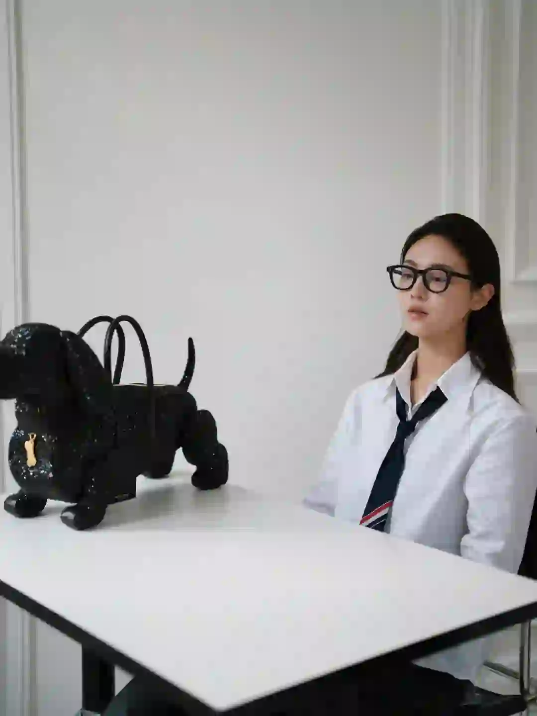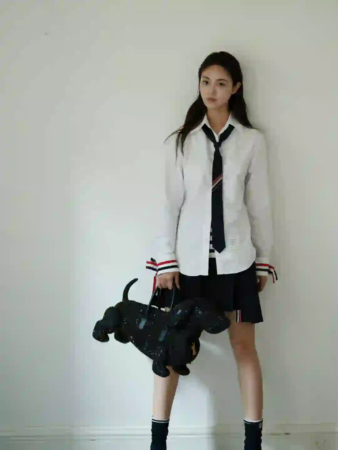 谁能拒绝一只特别的黑色小狗? 喜欢非「统一性」标准的任何 白色衬衫袖口蝴蝶结搭配同色系领带 剪裁精良的短制服 制服特征在于模糊人的个性和抹去区别性,将不同的个体以同一种范式着装形成紧密联系的「统一性」群体 Browne 通过对「制服」这一载体的重新剪裁,将矛盾性生动地体现。 冷静又浪漫的载体