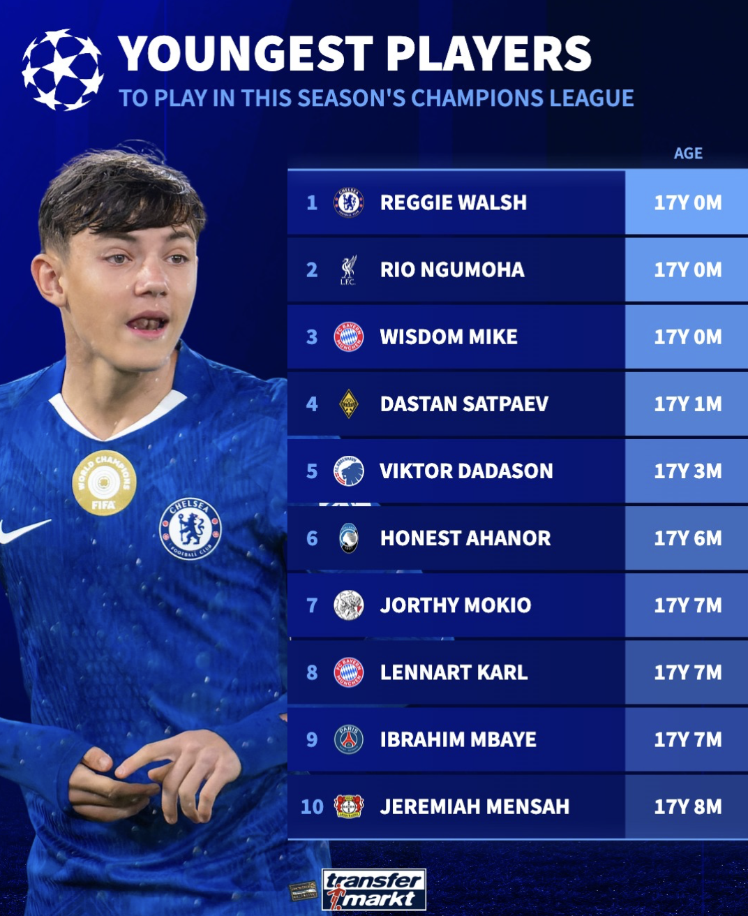 切尔西的沃尔什、利物浦的恩古莫哈和拜仁的迈克分别以17岁并列榜首。