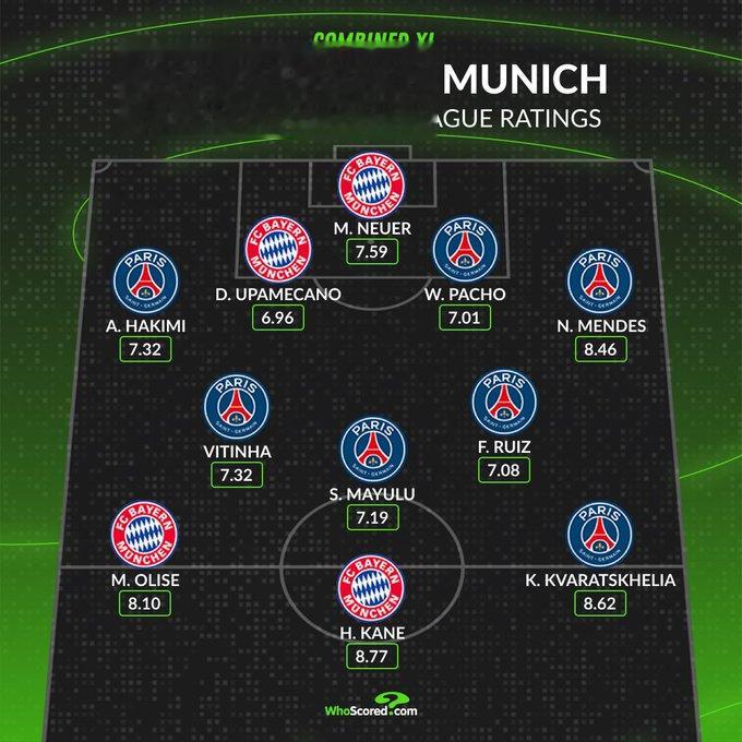 虎扑11月04日讯欧冠联赛阶段第4轮,巴黎主场对阵拜仁,赛前WhoScored盘点两队合体最佳阵容: