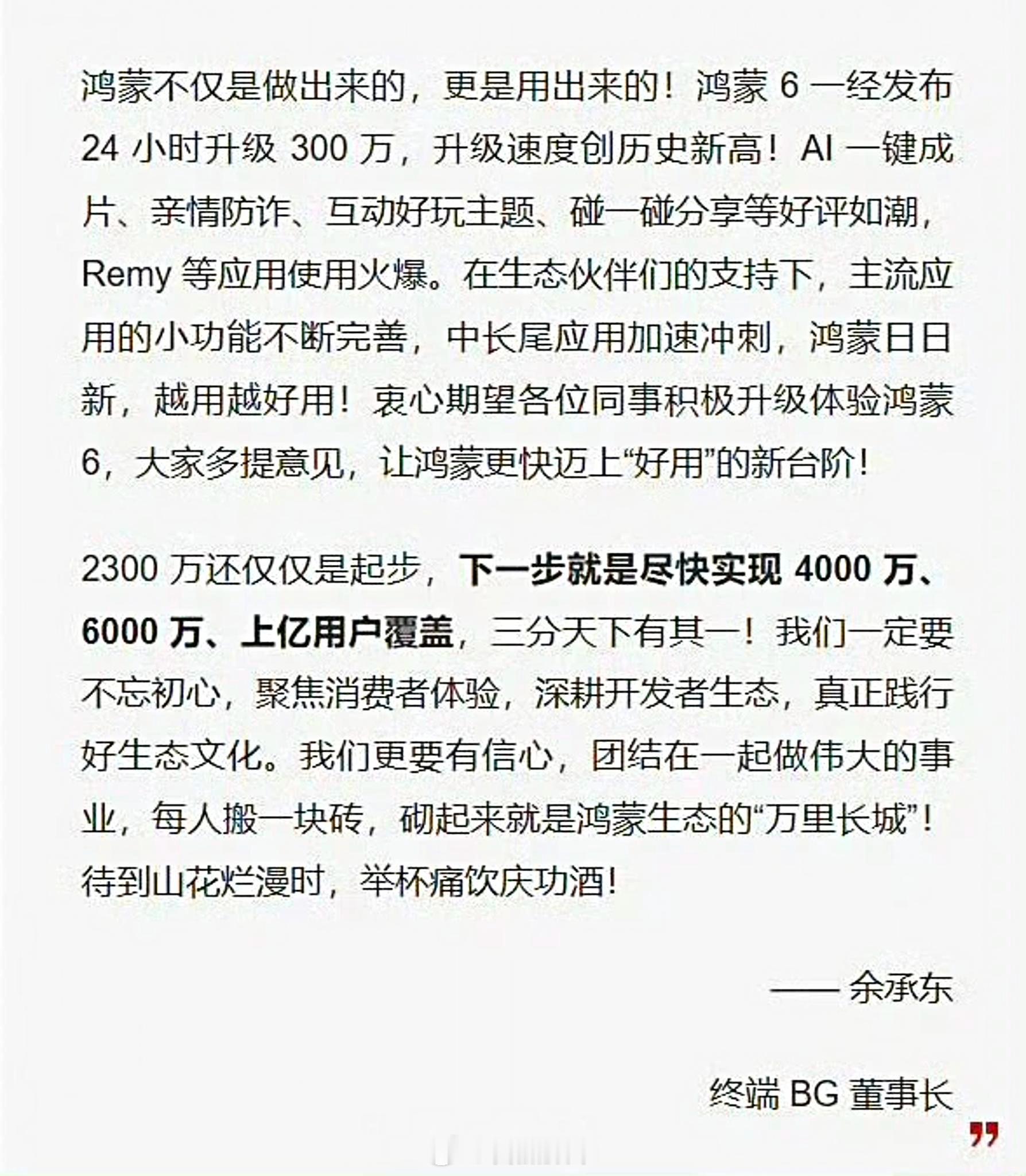 我绝对希望Harmony能够和Android以及iOS三分天下!余承东带队的业务