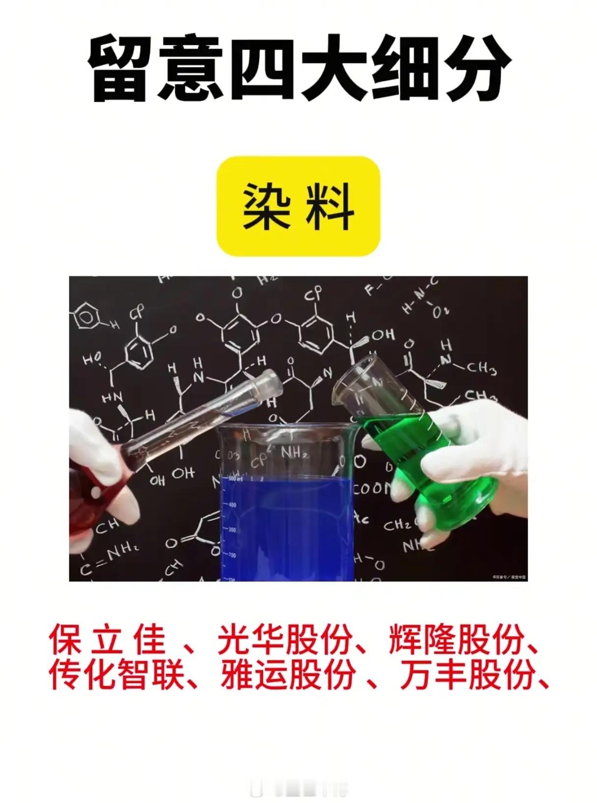 染料板块的保立佳、雅运股份等,一方面受益于行业集中度提升(头部企业市占率超60%),另一方面环保政策趋严推动落后产能出清,叠加海外需求复苏,染料价格近期环比上涨超15%,业绩弹性清晰可见。