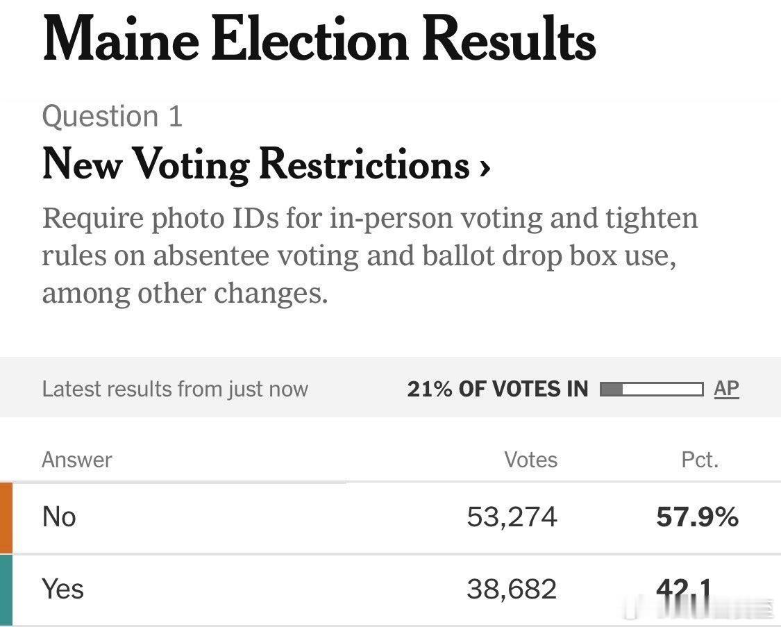 缅因州:限制选举的提案惨败(42%),限制枪支的提案大胜(59%)