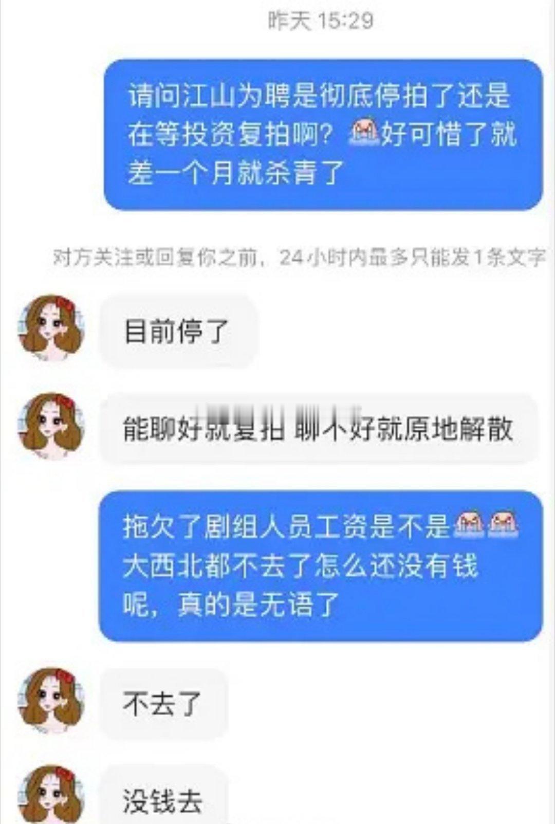 🍉🍉吴谨言 陈哲远《江山为聘》疑似停拍了??有网友爆出剧组拖欠工资,原本要去