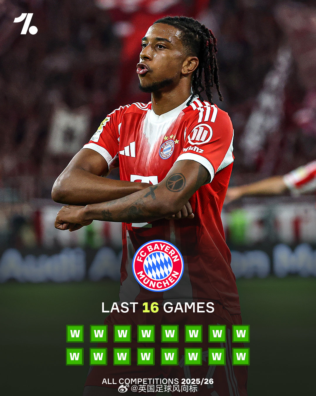 2025-26赛季开始至今,拜仁一共踢了16场比赛,9场德甲+2场德国杯+1场德国超级杯+4场欧冠,拜仁踢出了16连胜的强势表现。这个赛季,德甲巨人要冲击“三冠王”吗?