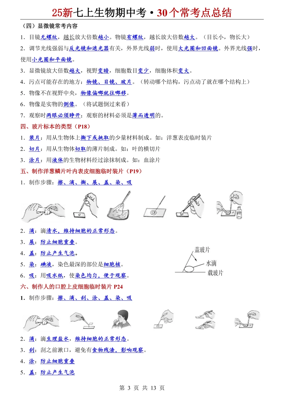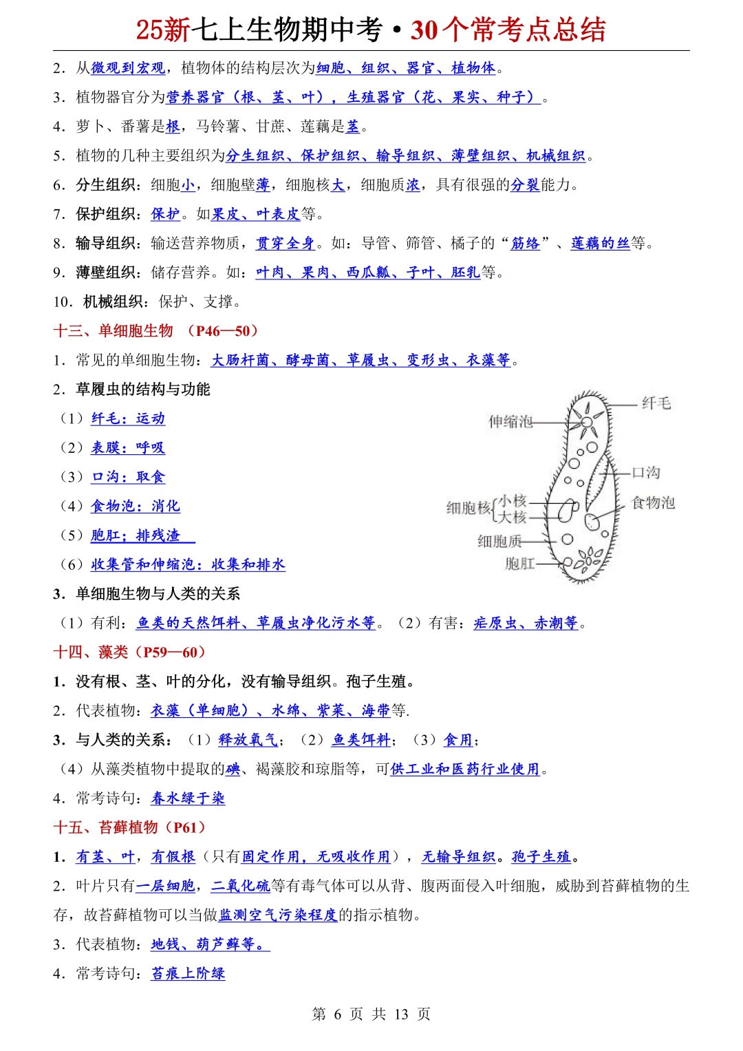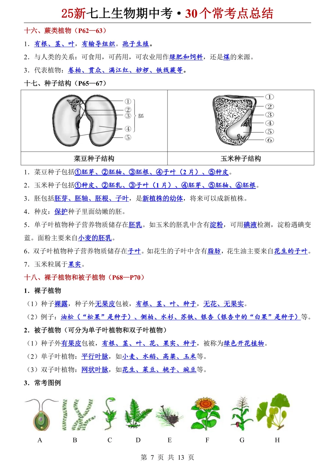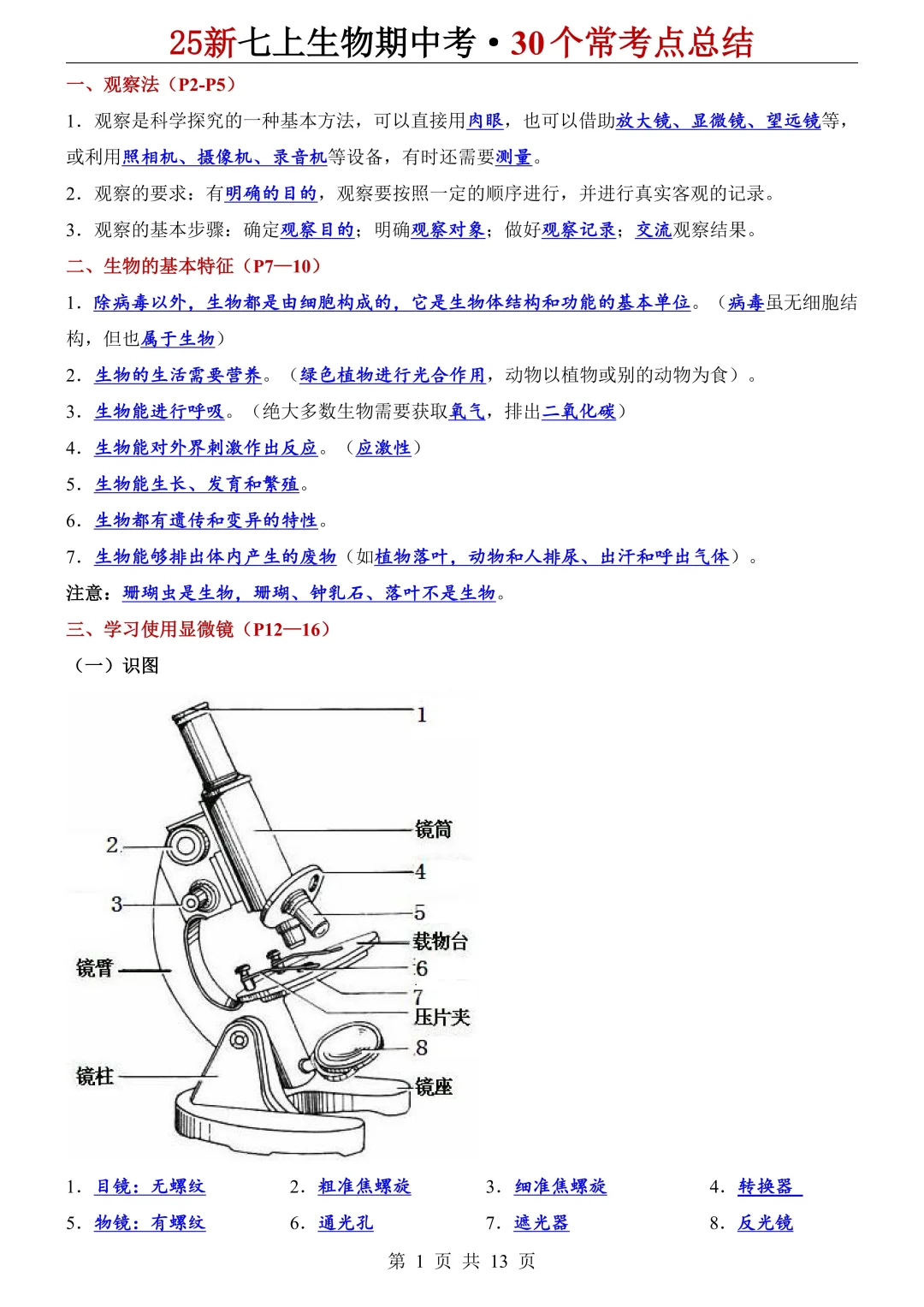初中生物 知识点总结 初中生物会考复习资料 必背知识点 生物笔记 生物 核心考点七上生物必考考点 期中考试