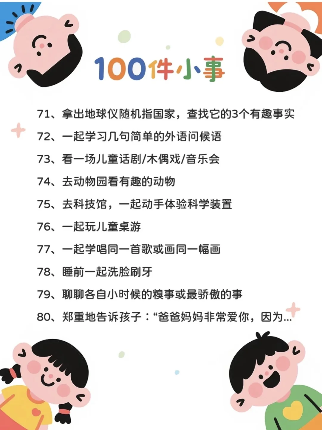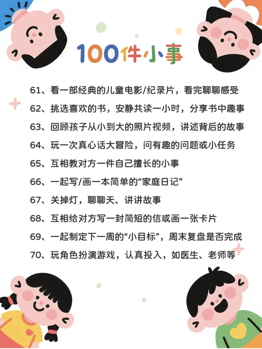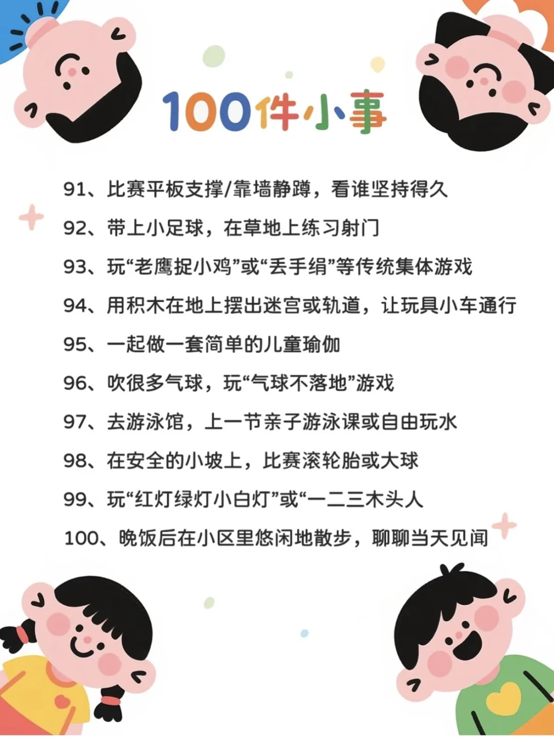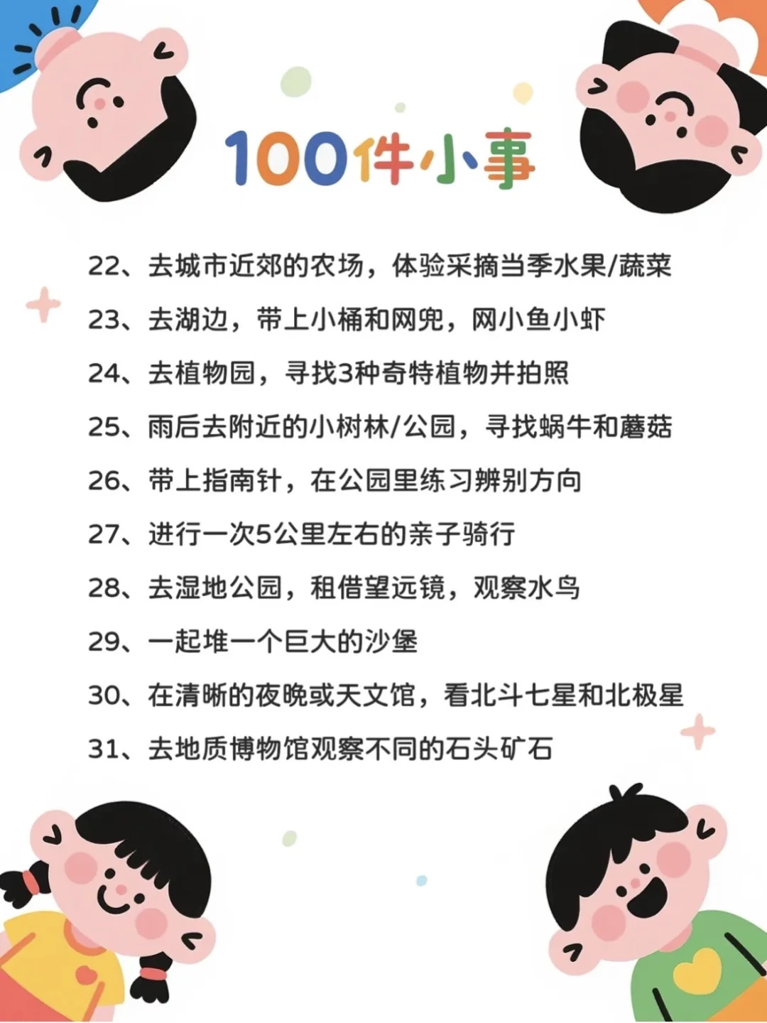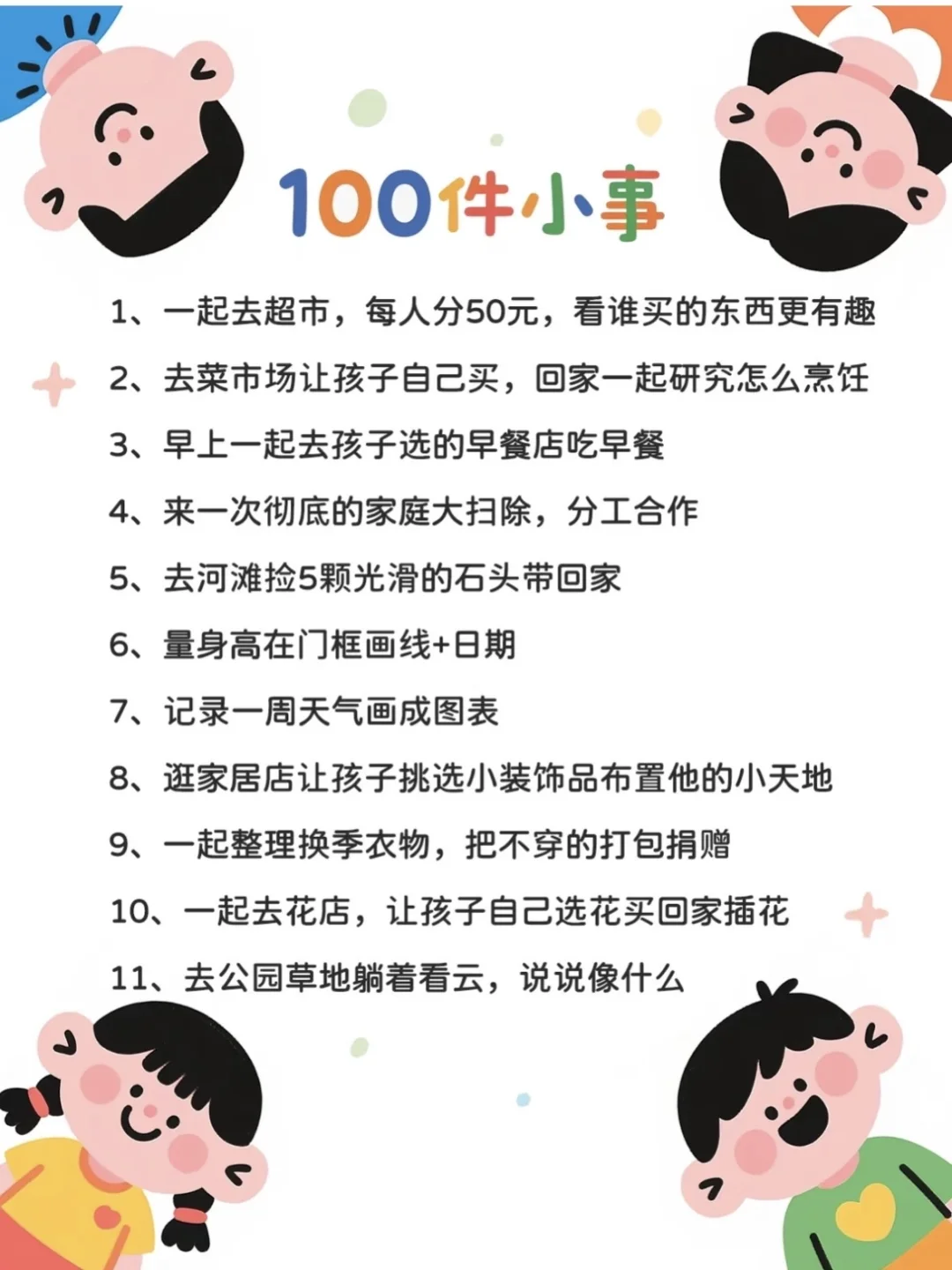 🌈我们总想给孩子安排快乐充实的周末 🌀有时候想破头也想不到要干嘛 📝这份清单里的100件小事 带宝贝一起慢慢完成 陪宝贝度过每一个快乐的周末😊 妈妈们有更好的周末带娃方式也来分享吧! ·