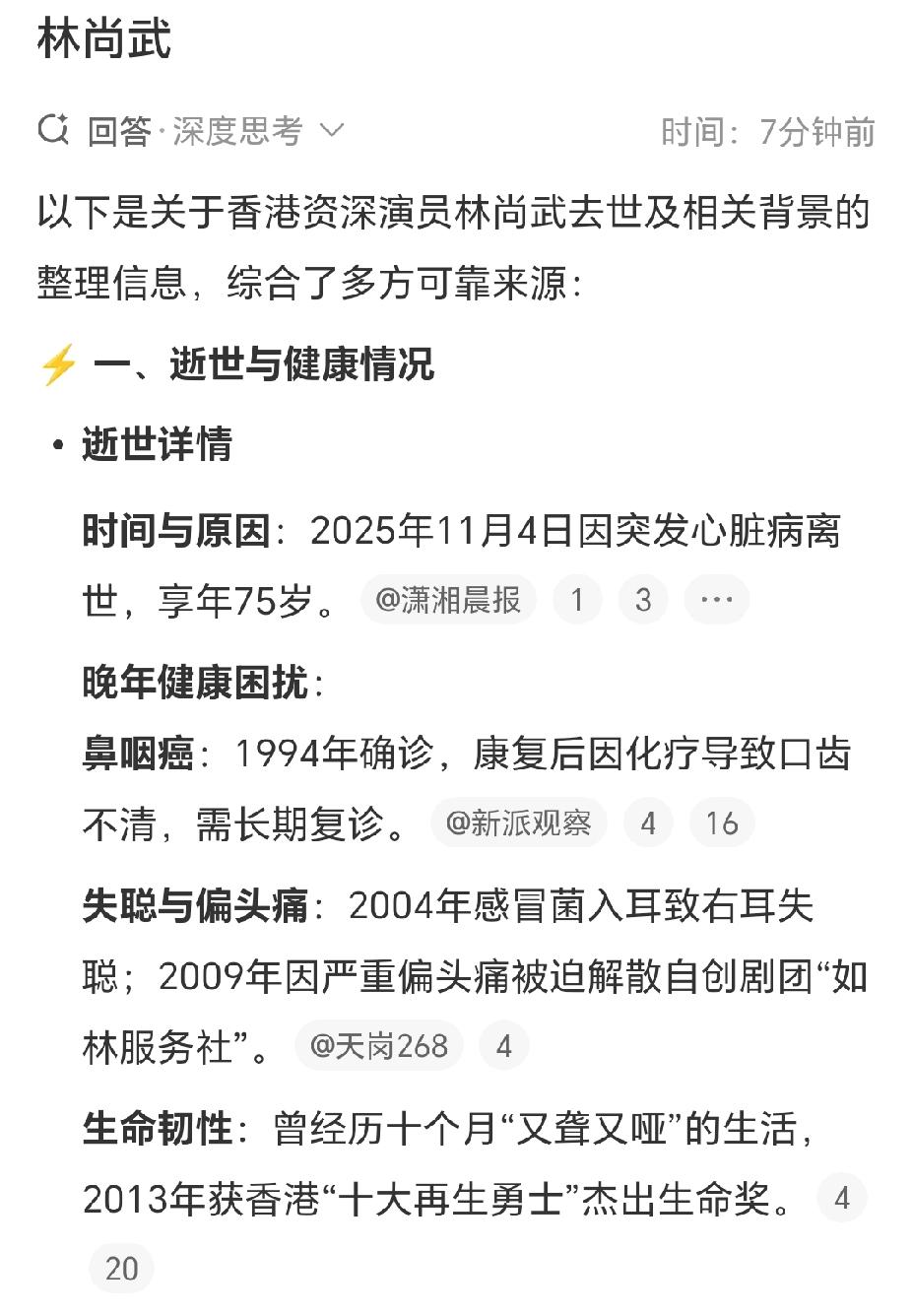 短短8天,竟然有四位香港老戏骨相继离世。从10月28日至11月5日,先后有许少雄、甄志强、冯淬帆和林尚武,4位香港男明星离世。 94版的《射雕英雄传》中,丘处机的扮演者林尚武,于11月4日因心脏病发去世,享年75岁。其实,林尚武还是一个抗癌达人。要知道他带癌症已经生存了31年。 林尚武之前亮相舞台剧活动时,身形就已经极为消瘦,而且需佩戴助听器。他的母亲当年也是因鼻咽癌去世的。早些年,港媒就曾报道过林尚武生前饱受鼻咽癌后遗症、听力障碍、偏头痛等健康问题的困扰。 林尚武1950年10月出生于香港,早年因间先加入香港话剧院,1989年签约TVB,正式开启了演艺生涯。林尚武被媒体赞为黄金绿叶,是港剧黄金时代演技细腻,张弛有度的一代表演艺术家。不管是正派还是反派,都能游刃有余的去驾驭。 他一生累计出演了40部影视剧,塑造很多经典角色。还比如出演过《蜀山奇侠之仙侣奇缘》的无尘真人、《武尊少林的康熙》,《一号皇庭》中的卢主控等角色。他的离世也让人倍感唏嘘啊!男演员离世