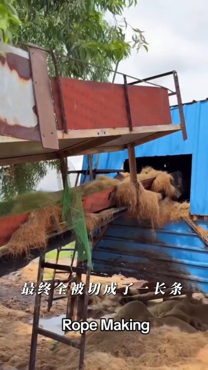 注意看眼前这堆果皮,看起来有点像椰子皮,它们全被集中倒在了一起,混合着上一任顾客留下的口水。阿三姐丝毫不顾及这些果皮中有没有臭味,直接挨个送进传送带,看起来它们已经适应了这种工作。 果皮随着传送带直接被送进了机器里,机器将这些果皮进行360度的无死角粉碎,最终全被切成了一长条的丝状物。紧接着下一道工序,这些果皮全都被送进了过滤网里面进行过滤,将不合格的果皮给过滤出来。看着阿三使用的机器,不由得感叹当地先进的生产力,最终筛选出来的果皮全被堆在了一起。 阿三哥看到后赶紧调试装备,手动启动机器让其运转。机器开工后,果皮被送到这里再次进行搅拌,此时可以看到搅拌完的这些果皮明显更细了。但这并不是最重要的,旋转的机器将这些果皮全都搅在了一起,最终变成了一条绳子。 阿三哥将做好的绳子固定住,拉好绳子的一头再将其全部卸下来。随着机器的转动,能看到这些绳子长度还是很长的,就是不知道这绳子经过这几道工序之后还有没有阿三的口水味。