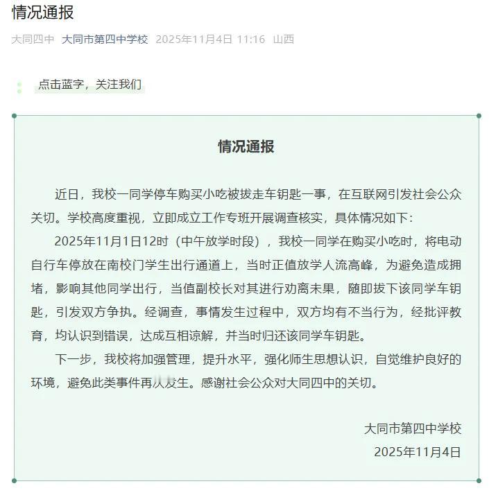 大同四中火了。 只因为女生去买了一根淀粉肠,就被副校长拔了钥匙,引起一片网络热议。 于是,有无数网友、学生去校门口买了淀粉肠;于是,校门口卖淀粉肠的消失了。 校方也发出通报,是因为学生将车停在校门口,正值放学高峰,副校长劝说无果才拔的钥匙。可是从视频看,当时未见拥堵的人流,而且拔了钥匙,电动车还在通道上,更影响学生通过,问题也没解决。 最后肯定和解,因为学生是绝对弱势群体。