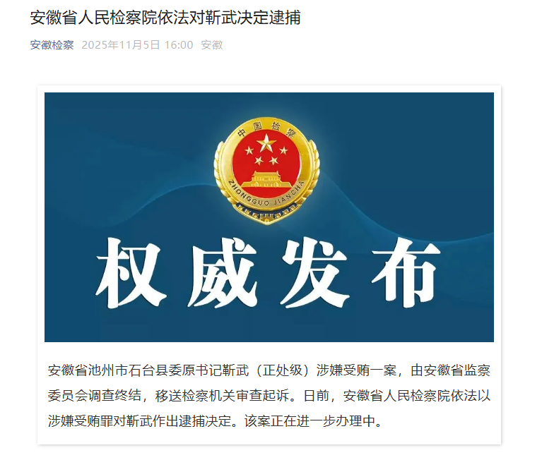 安徽省池州市石台县委原书记靳武(正处级)涉嫌受贿一案,由安徽省监察委员会调查终结,移送检察机关审查起诉。日前,安徽省人民检察院依法以涉嫌受贿罪对靳武作出逮捕决定。该案正在进一步办理中。