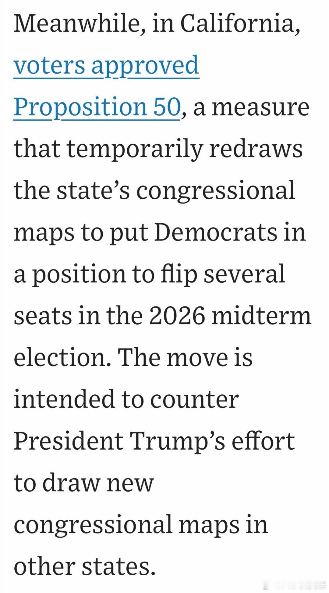 加州选民投票通过(目前58%✅):修改州宪法,暂时停止独立委员会划区工作,由州议会重新划分选区,直到2030新人口统计数据出台