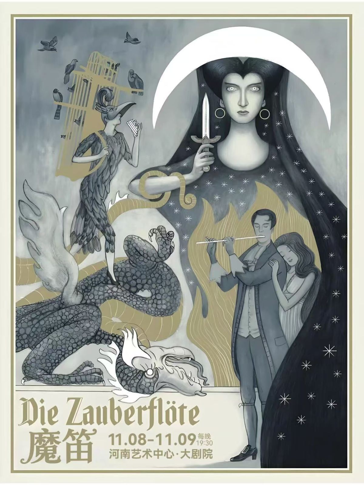 故事情节:埃及王子塔米诺在森林遇巨蟒昏倒,被夜后的三位侍女所救,侍女留下帕米娜(夜后之女)肖像,塔米诺见肖像一见钟情。捕鸟人帕帕基诺路过谎称救了塔米诺,被侍女拆穿惩罚;侍女告知帕米娜被萨拉斯特罗带走,赠塔米诺“魔笛”(驱危险、唤真爱)、帕帕基诺“魔铃”(带好运、安人心),委托营救。夜后现身哀求塔米诺救女,威胁失败则让他粉身碎骨。塔米诺与帕帕基诺到神殿后,从祭司处得知真相:萨拉斯特罗是光明化身,夜后是黑暗代表,带走帕米娜是为护她免受暴政控制。塔米诺决定留下,见到帕帕米娜后一见钟情,萨拉斯特罗宣布:塔米诺需过“沉默、水、火”三重试炼才能娶帕米娜,帕帕基诺需戒欲才能得真爱。