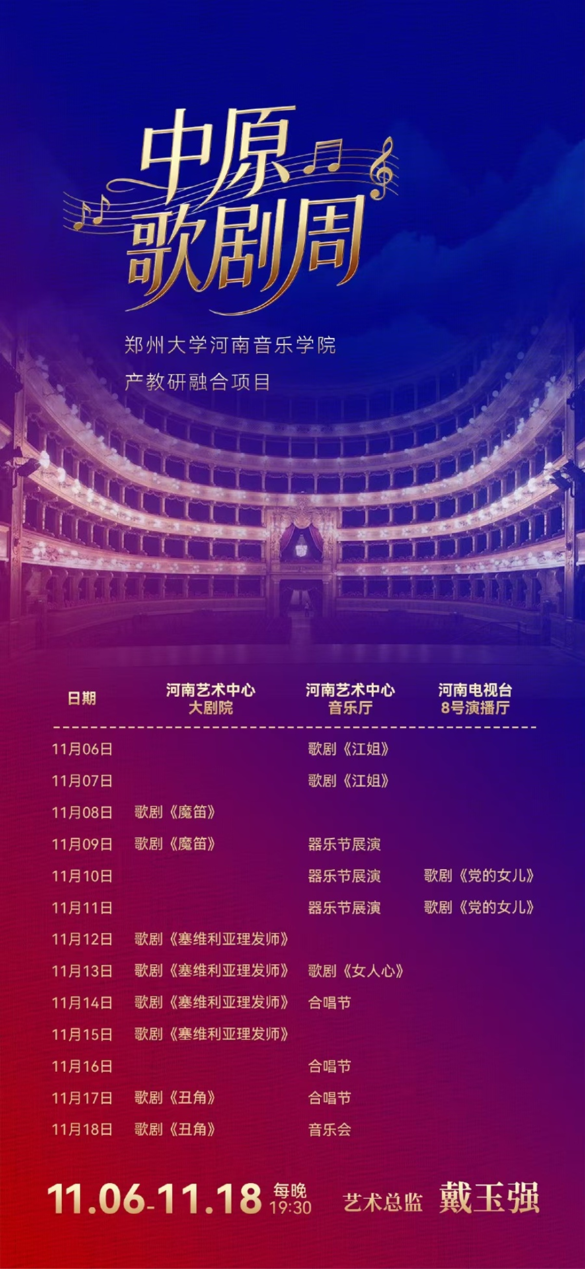 11月6日至18日,"中原歌剧周”将在郑州举行,郑州大学河南音乐学院院长、著名男高音歌唱家戴玉强担任艺术总监,《江姐》《魔笛》等六部中外经典歌剧将集中上演,为市民带来一场高雅艺术盛宴。