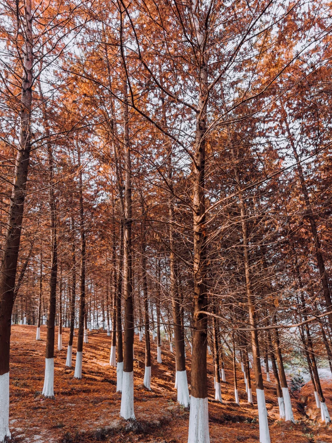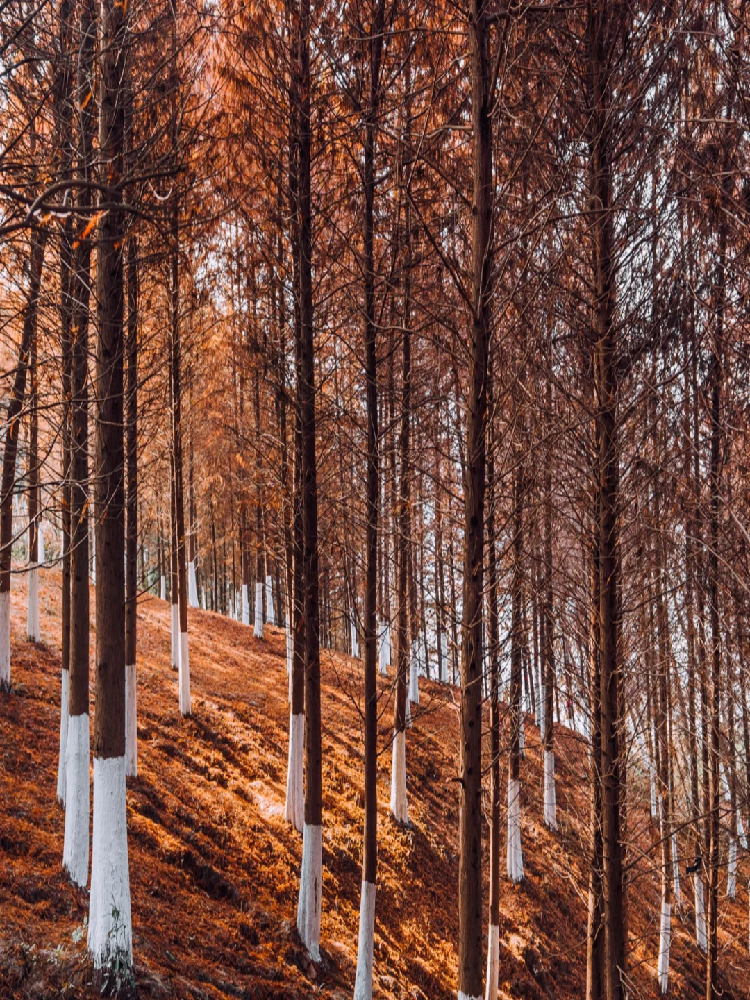 大片的红色水杉林在江畔旁特别应景,像是打翻了调色盘一样,色彩唯美又浪漫,尤其是阳光透过水杉照射下来,洒在身上的光影感真的美到爆炸,树影婆娑的斑驳感,给人一种温暖