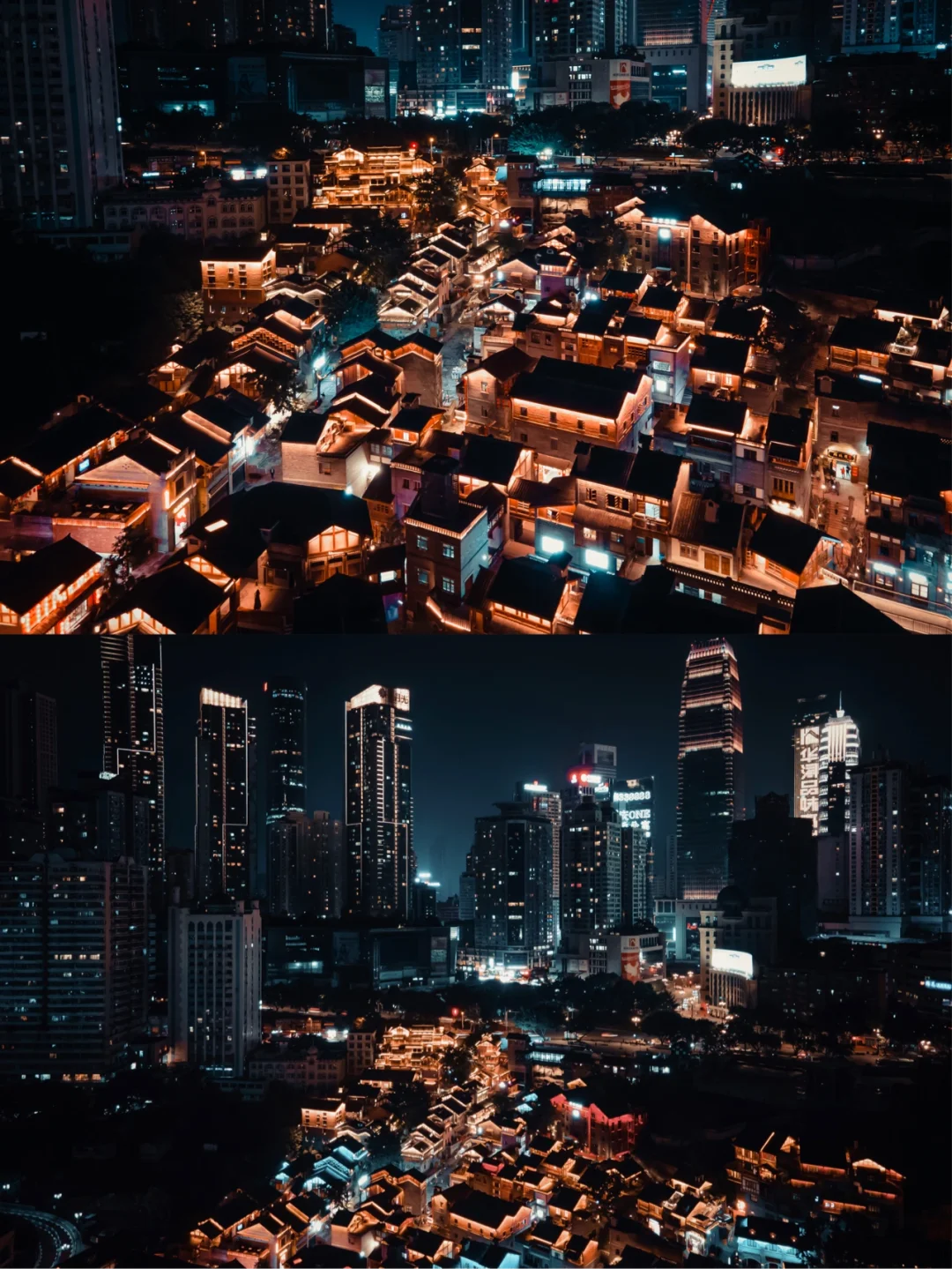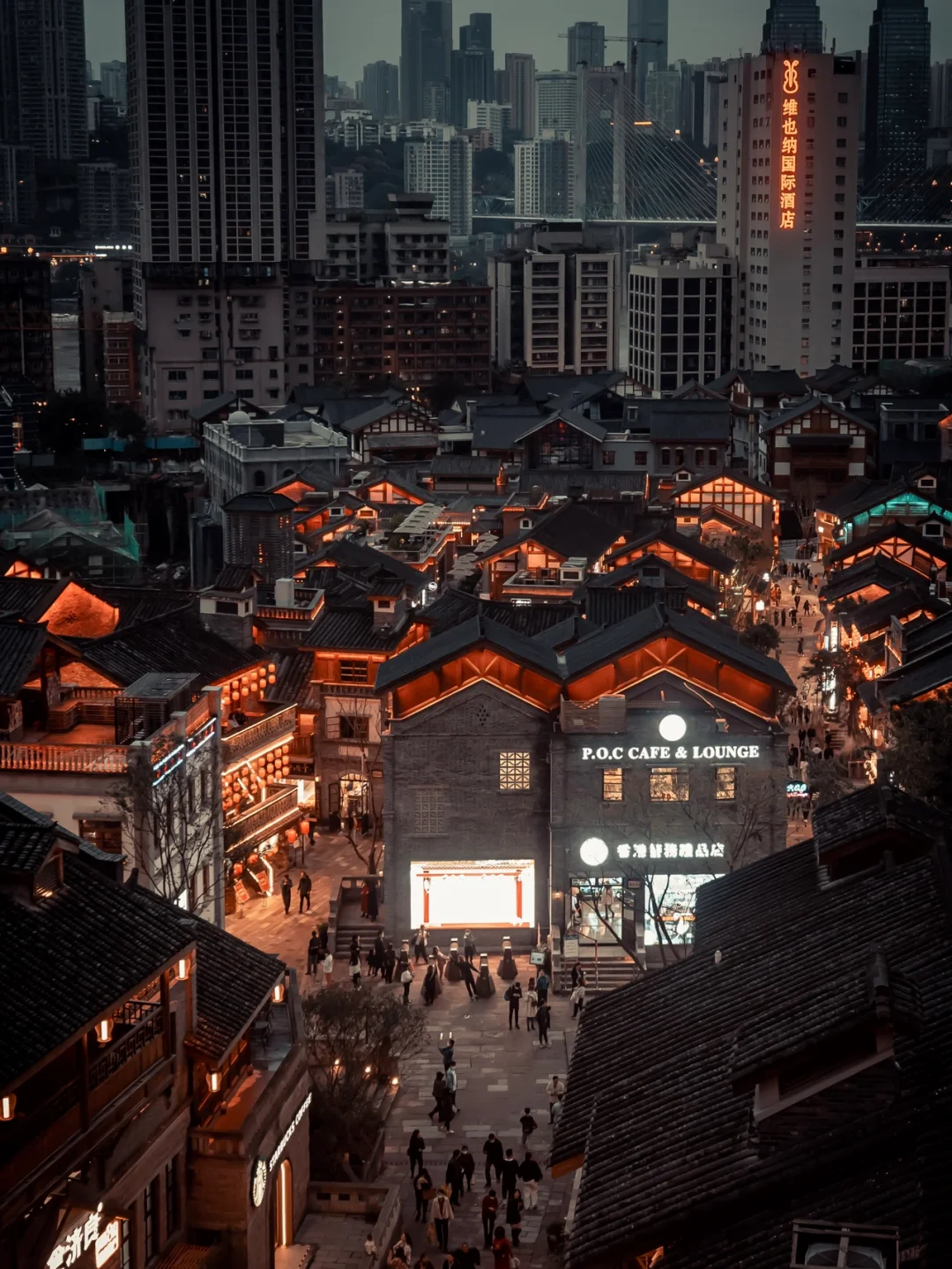 1⃣️航拍机位可以拍到解放碑核心商圈和十八梯的一层层的古建筑。