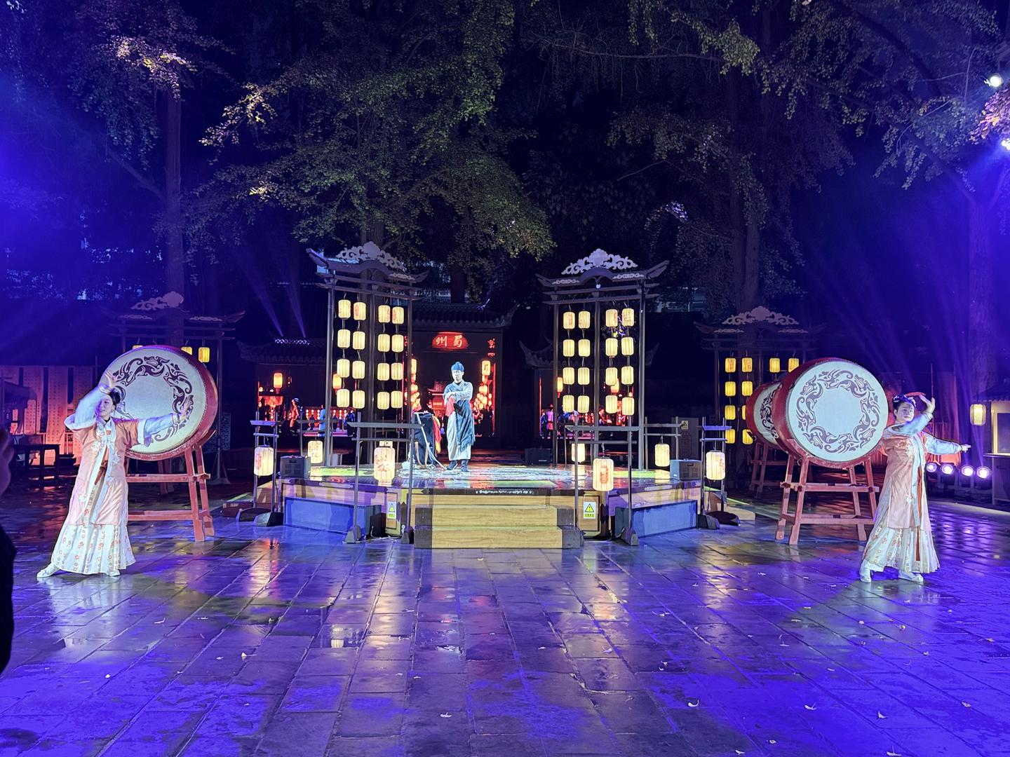 开幕式上,在罨画池的园林实景中,打造了一场从入场即开始的全沉浸式文学之旅。嘉宾甫至,便在《陆游·梦回罨画》迎宾舞中步入宋韵场景。随后,沿湖欣赏画舫清音,于银杏林中体验猜灯谜、投壶、点茶等丰富多彩的“宋潮”夜生活,并在陆游祠先睹“陆游诗意书画展”。开幕式上,“文润天府”“梅馨千年”“锦城新声”三大篇章依次呈现。