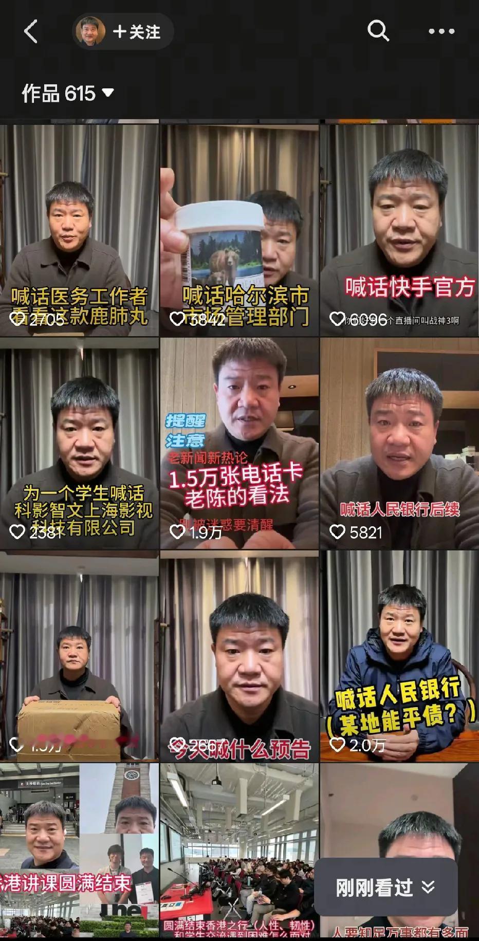 没关注老陈,但是总会时不时刷到老陈,最近半年,发现老陈的抖音风格换了,变成了一系列的“喊话”打假!老陈的流量越来越好了!看来这个系列大家爱看! 前段日子还看到有媒体支持老陈,老陈像是被人认可了,表现的很是激动,还专门发了视频晒图感谢。 自从老陈辞职后,有一段时间,感觉他整个人比较消极,账号内容上,也没什么突破,一直不温不火,都担心老陈会抑郁。 如今,老陈应该是找到了创作内容的方向,这个“喊话”打假系列,也涨了很多粉,视频也越来越多的人观看、点赞、留言。 说实话,挺不容易的!那就祝福老陈,越来越好,只要是做好事,那就值得鼓励和支持!大家说是不是啊?反诈老陈