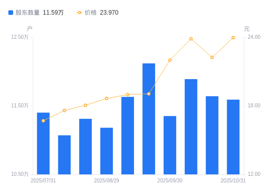 近一年(2024年10月31日至2025年10月31日),西部矿业A股股东户数从10.86万户,增加至11.59万户,增幅6.72%,区间股价上涨40.50%。