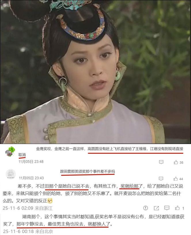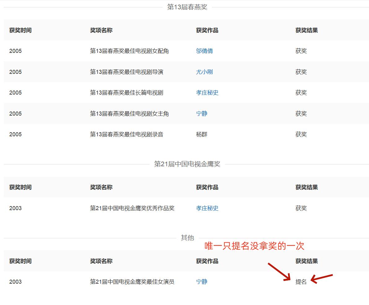 宁静自曝因为没到场,奖项被主办方给了别人! 白百何和王传君的奖项之争,让娱乐圈“夺奖”背后的“暗箱操作”,浮出了水面。 宁静爆料说,自己也曾被“撤回”过奖项。 当时,她主演的电视剧《孝庄秘史》,拿到了“最佳女演员”的提名。 但她正在另一个剧组拍戏,没办法赶去参加颁奖礼——如果她请假,剧组的经济损失会特别大。 结果,组委会打电话通知宁静,“你不能来,奖就给别人了。” 宁静还以为自己听错了,没想到后来主办方真的把奖项给了排在第二梯队的人。 她吐槽说:“我不是最好的吗?我也不是有意不去的啊!但是第二梯队,你也没有评出最好的啊!” 这件事她一直过不去,从此“拉黑”了这个颁奖礼,“姐不愿意去,就不给脸啊!” 网友们按图索骥,发现在《孝庄秘史》的获奖记录中,唯一获得提名却没拿到奖的,只有2003年的“金鹰奖最佳女演员”。 和宁静同时入围的,还有蒋雯丽、宋佳、许晴、沈傲君等女演员,但最后斩获奖项的是《女装甲团长》的范志博(最佳男演员是李保田)。 难怪宁静会不服了…… 网友:“金鹰之前一直这样,高圆圆没有赶上飞机直接给了王维维,江珊没有到现场直接取消……” 话说,宁静和白百何,都是典型的“谁也不惯着”,手撕主办方,阴阳对手…… 一系列操作是真猛啊。