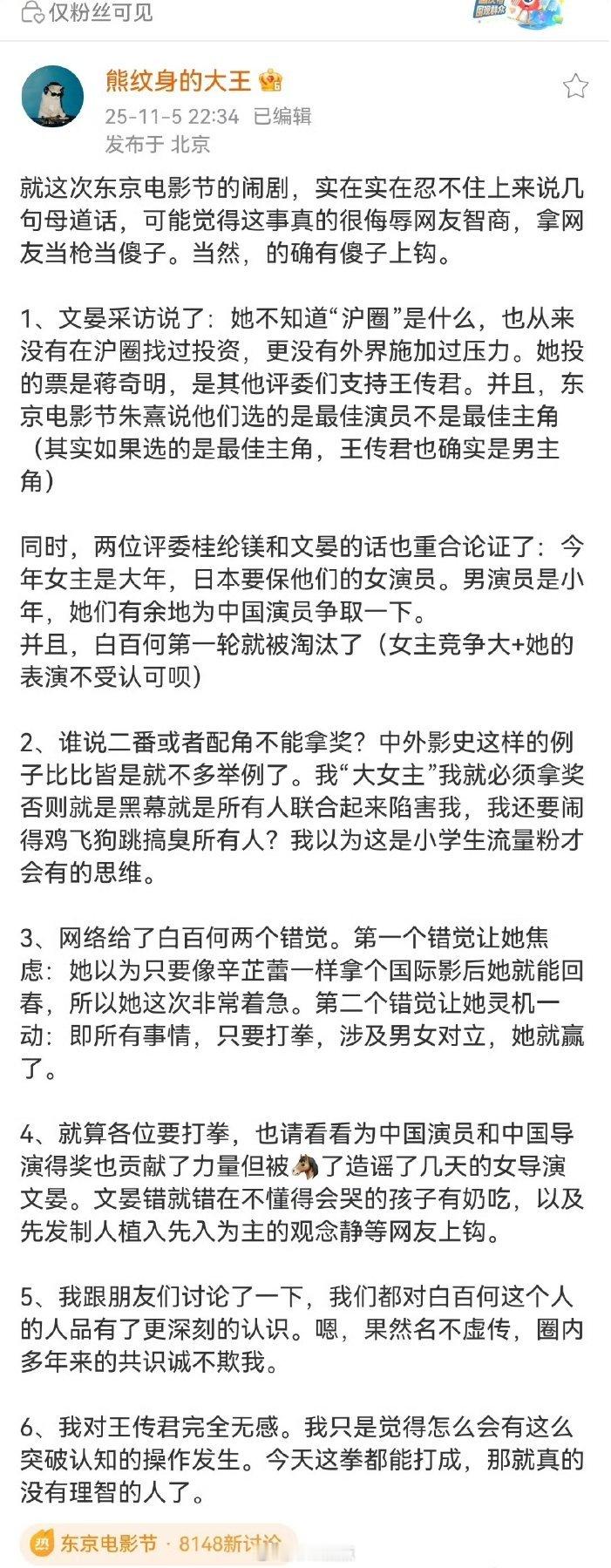 这段话,这么看就是内部人员放的,先排除导演和王传君,白百何 范🧊🧊哪一方放的[思考]? 白百何,冰冰,文晏三个都是女的,文晏淘汰了白百何,强烈反对冰冰,这里面骂王传君就没逻辑啊…影后和影后竞争,淘汰了!骂王传君的作用在哪里?又不是和王传君竞争影帝?现在业内发了,大概就是白百何不体面[思考] 千言万语等电影上了大家自有判断