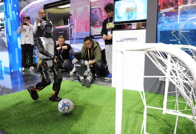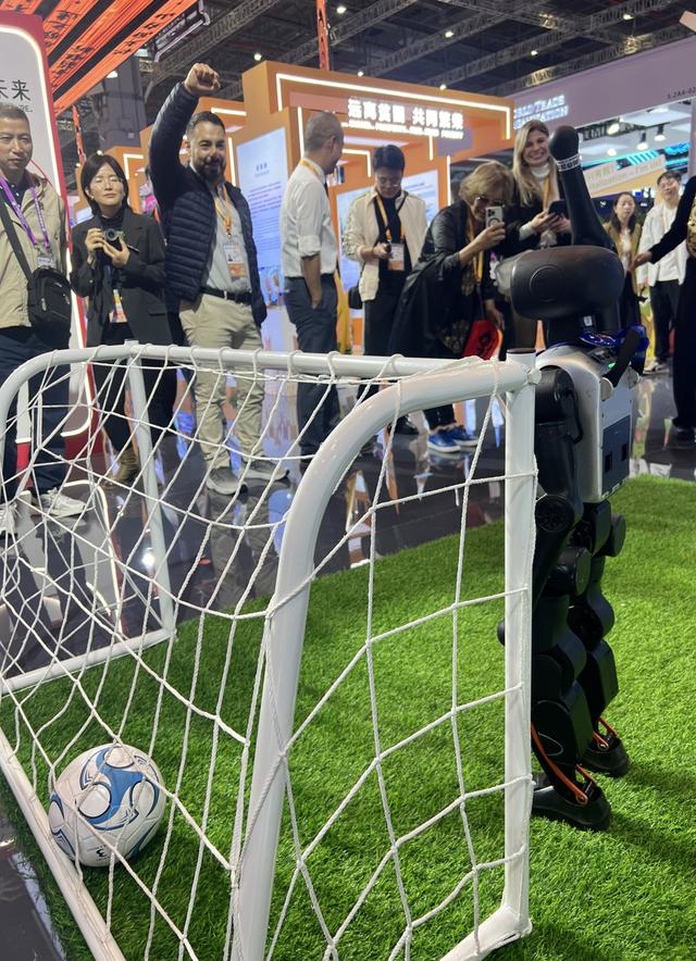 亦庄人形机器人进球后,外国友人和它挥拳互动庆祝。