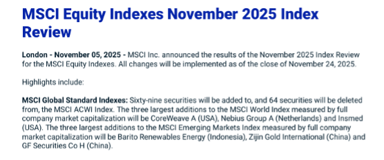 MSCI宣布将对ACWI指数新增69只成分股、剔除64只成分股
