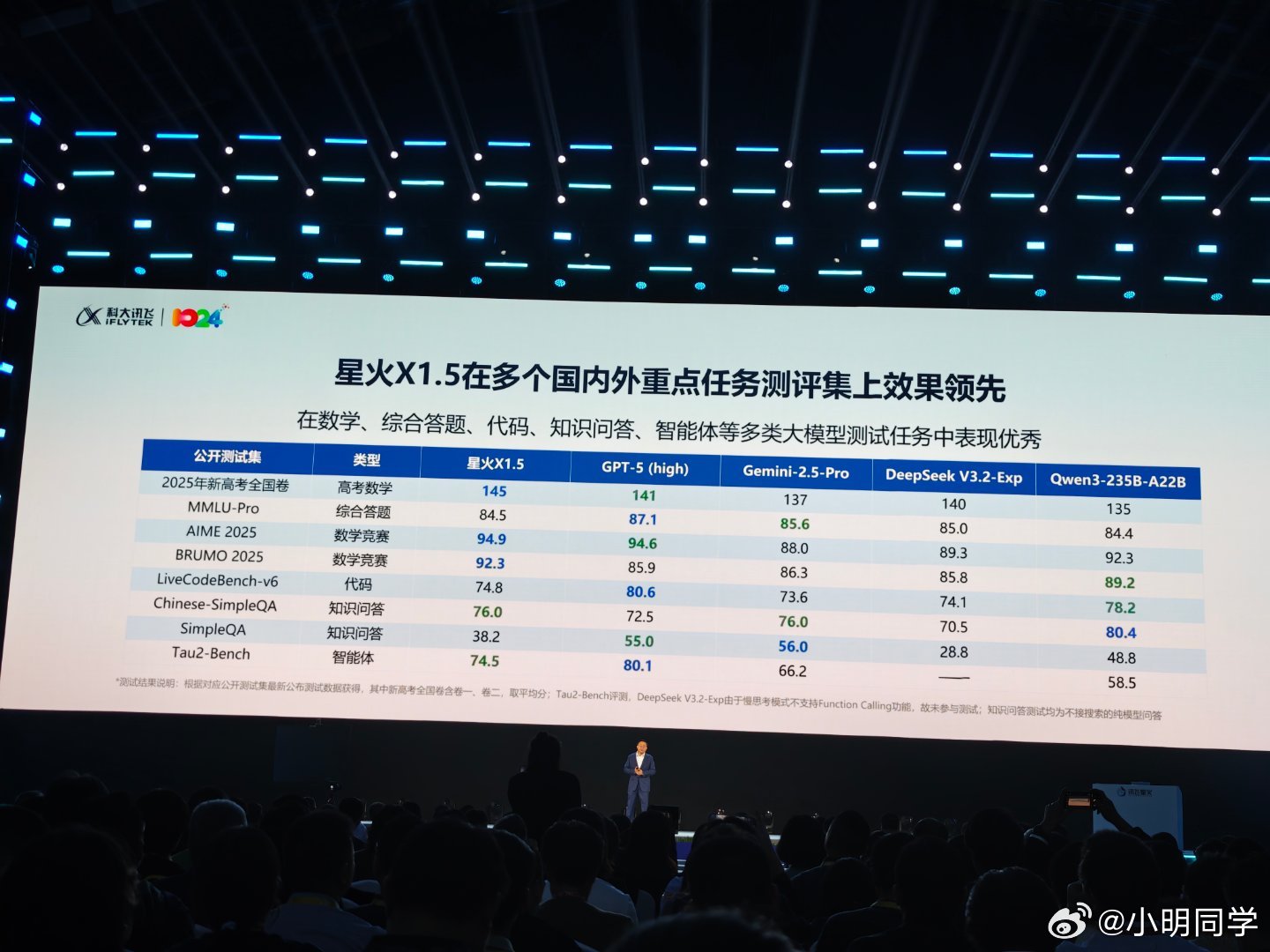 全国产AI更懂你 11月6日,科大讯飞发布基于全国产算力的讯飞星火X1.5深度推理大模型。该模型率先在全国产算力平台上攻克MoE模型全链路训练效率,端到端性能达到国际竞品效率的93%以上。其语言理解、文本生成、知识问答、逻辑推理、数学能力、代码能力等对标国际主流大模型,其中,数学能力持续保持国际领先。同时,星火多语言能力持续升级,支持130+种语言,整体性能达到GPT-5的95%以上,为世界提供AI发展的“第二选择”。 科大讯飞全球1024开发者节