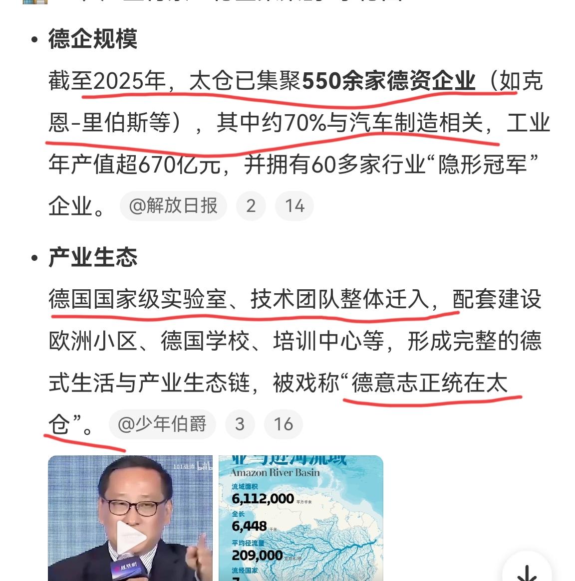 如果德国经济部长弄不明白:“正统德国工业看太仓”这句话的含金量, 她提出的问题,永远不会有答案。 时至今日当这些欧洲女政客还在搞:供应链多元化的脱口秀时。 这个国家的多座国家实验室却选择连同技术人员,整体搬迁到一个县级市太仓。 809.9平方公里几十万人口的太仓,集聚了550多家代表德意志正统工业的真正德企。 可以说这些德企的名单里,就隐藏着足以代表德意志百年工业的全部荣耀。 如果欧洲不能停下指责,真正的反思自己。 那就可以用一句你们的名言:人总会流向适合生存的土地,文明在哪里,人就在哪里。