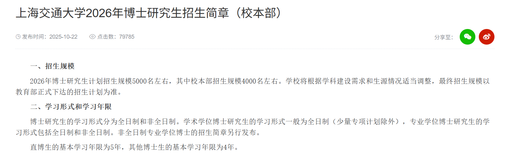 上海交通大学研究生招生网官网招生简章显示,2026年博士研究生计划招生规模5000名左右,其中校本部招生规模4000名左右。