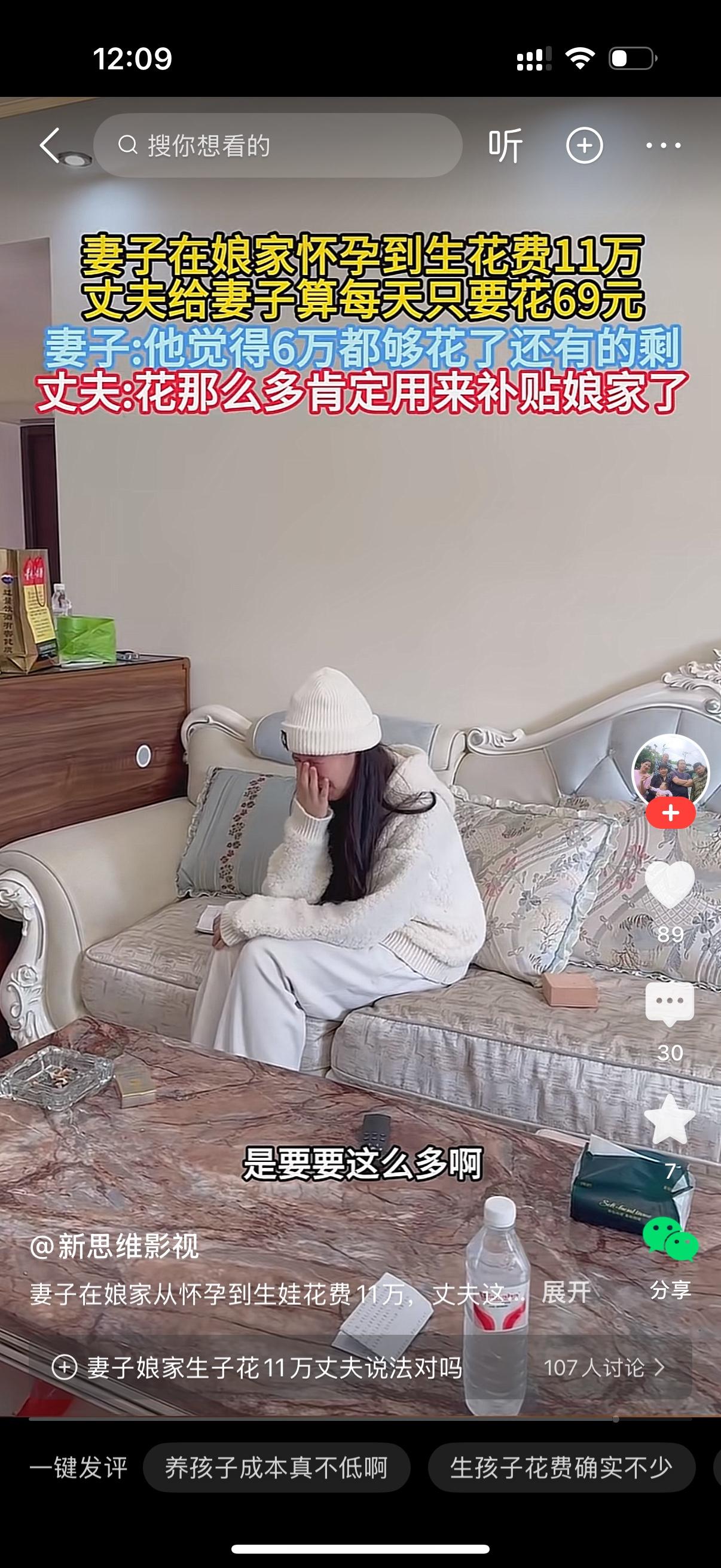 妻子在娘家怀孕到生花费11万。丈夫给妻子算每天只需要69元,总共在娘家住了1年,满打满算也就24000。再加上住院生产的费用,顶多30000块。所以丈夫认为给6万绝对够了,还有的剩。丈夫拿起账单对妻子吼,你怀个孕真的要这么多钱吗?妻子有点委屈,是要这么多啊。丈夫打死都不相信,花那么多一定是补贴娘家了。