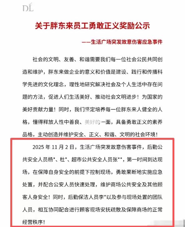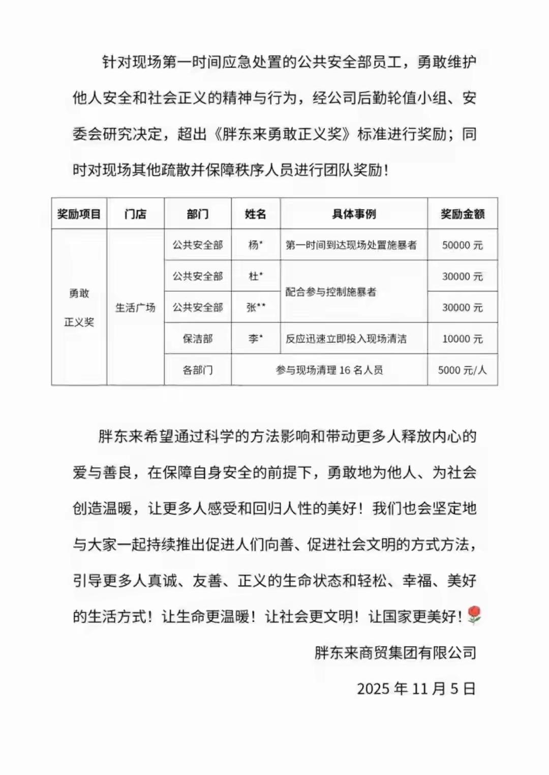 “如果以后胖东来再有突发事件,轮不到保安来,顾客就冲上去了!”许昌胖东来生活广场伤人事件嫌犯被抓获后,胖东来拿出20万奖金奖励20名员工。 给予处置施暴者员工奖励5万元,配合参与处置施暴者员工2人分别奖励3万元,反应迅速立即投入现场清理的一人1万元,此外参与清洁的其他16名员工各5000元。 不得不说,这次胖东来是太有格局了!既然有相关的规定,就按规定办。可以说这次的奖励有点“狠”啊!不羡慕才怪呢! 就应该这样,见义勇为就应该得到鼓励,如果以后有类似的情况,我敢打赌事不关己的这种情况不会发生。 其实,每个人的心里都有一股正义感,只是有些情况让人的心凉了而已。 这次胖东来给员工的奖励,不论钱多钱少,说到底就是对见义勇为者的认可。 这样的企业才是大家需要的,支持胖东来!
